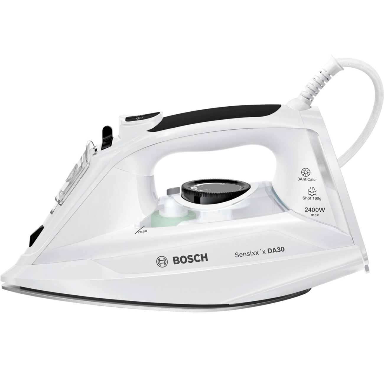 Bosch Sensixx'x DA30 TDA3024050 – утюг мощностью 2400 Вт, которому «по плечу» любые складки. Пар, подающийся со скоростью до 40 г/мин, проникает в волокна тканей и позволяет быстро разгладить их всего за один проход, а в особенно сложный случаях помогает паровой удар (160 г/мин).