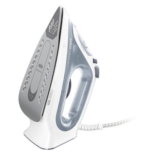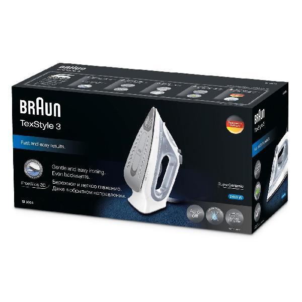 Утюг Braun SI3054GY в бело-сером корпусе подает пар интенсивностью 45 г/мин. Предусмотрен паровой удар силой 180 г/мин. Резервуар для воды вмещает до 270 мл.