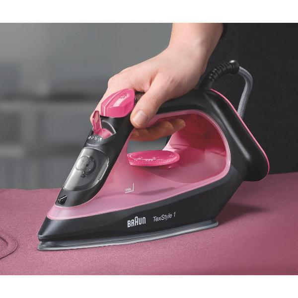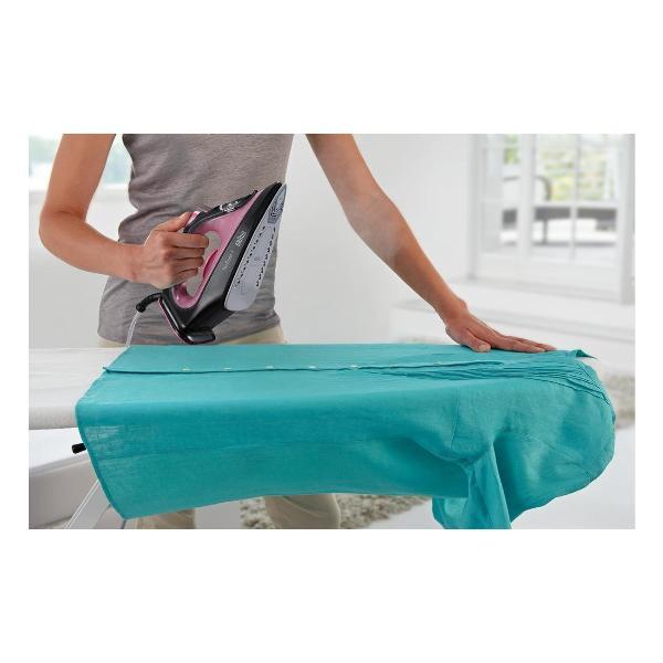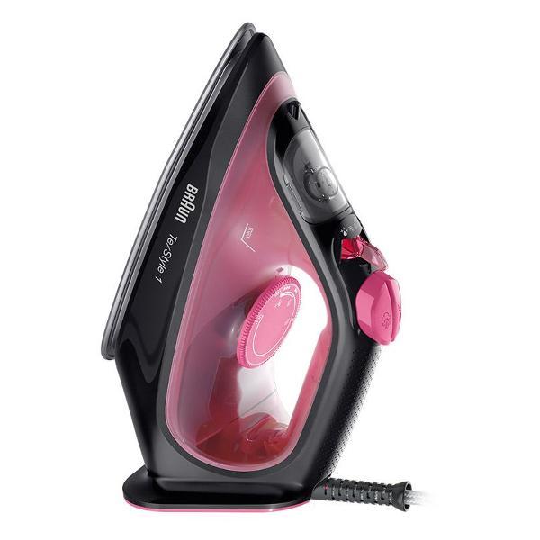 Устройство автоматически отключается при неактивности и самоочищается от накипи. Присутствует индикация готовности к работе и уровня воды. Потребляемая мощность — 2000 Вт. Покрытие подошвы: Super Ceramic. Сетевой шнур длиной 1,9 м крепится на шаровое крепление. Цвет: черный, розовый. В комплекте идет мерный стакан.