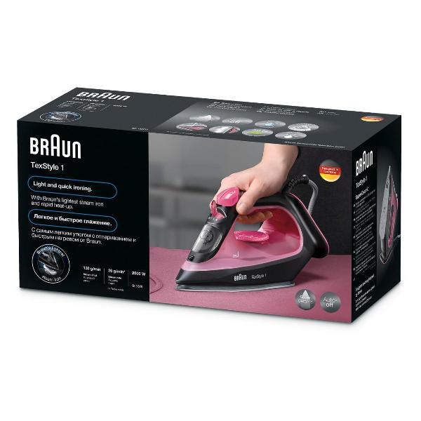 Утюг Braun SI1070PU выполнен в корпусе из пластика и весит 0,85 кг. Предусмотрен быстрый нагрев, четыре температурных режима с механическим управлением в диапазоне от 80°С до 180°С, вертикальное отпаривание с силой 140 г/мин и противокапельная система. В процессе глажки можно доливать воду и регулировать подачу пара.