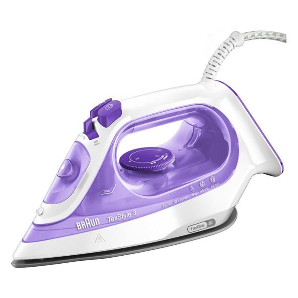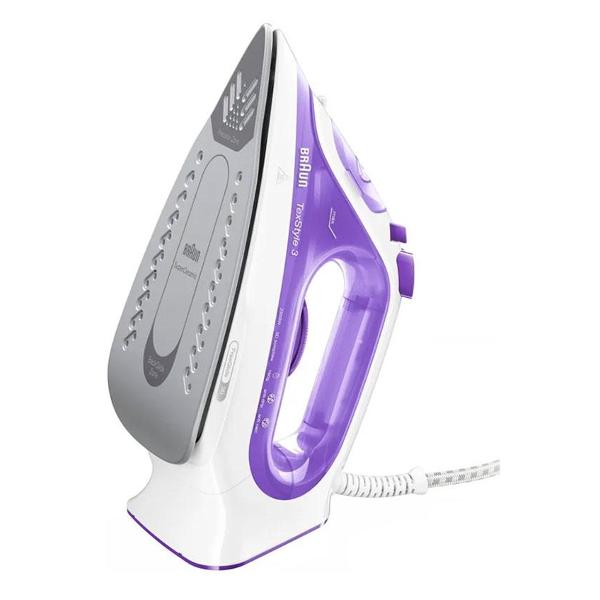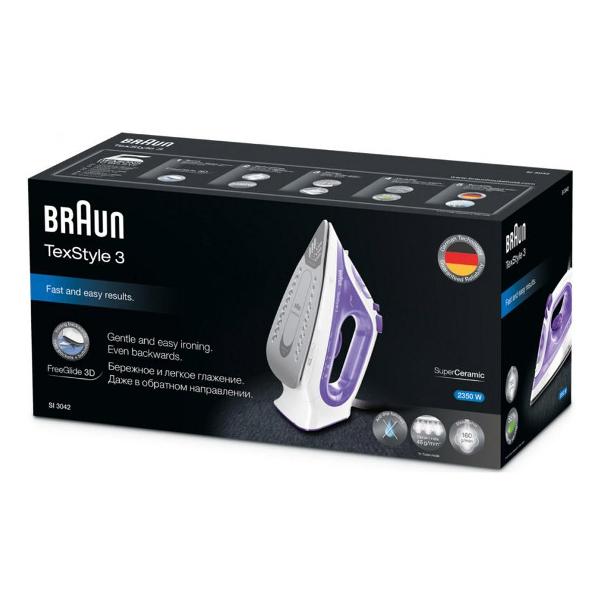 Утюг Braun SI3042.VI мощностью 2350 Вт оснащен керамической подошвой, которая не портит ткани и легко скользит по любому материалу. Прибор равномерно разогревается за 35 секунд, снабжен индикаторами включения и поворотным регулятором температуры. Объем резервуара для воды составляет 270 мл — такого количества хватит на длительное время глажки.