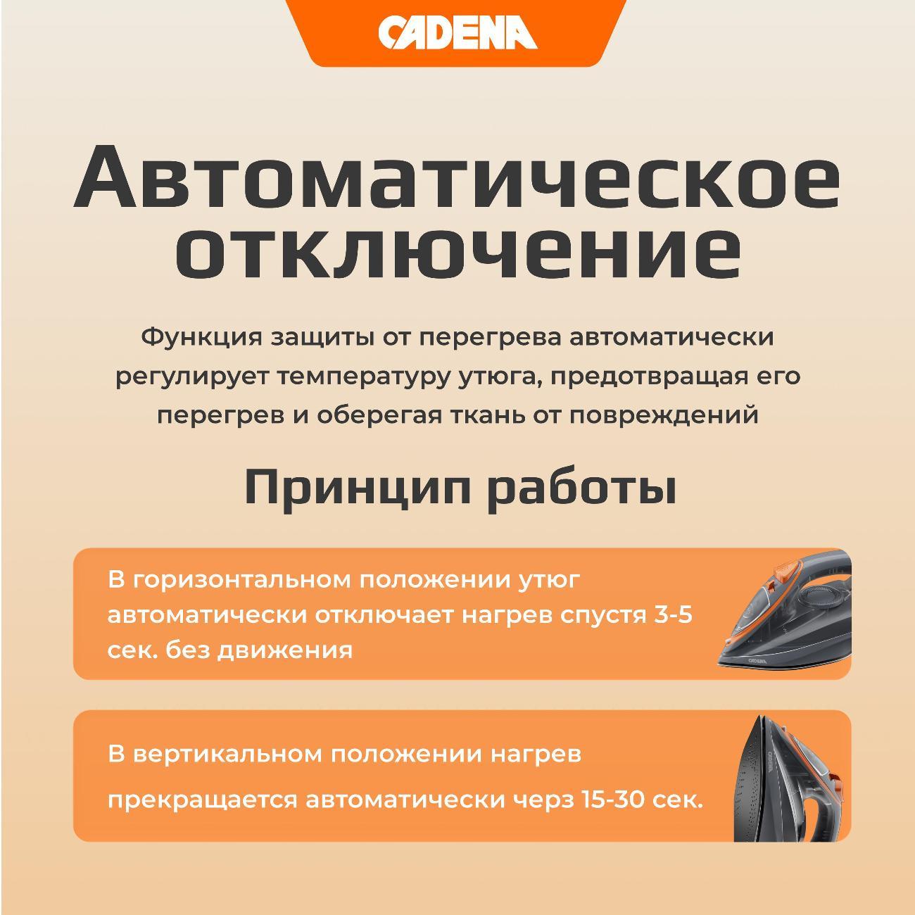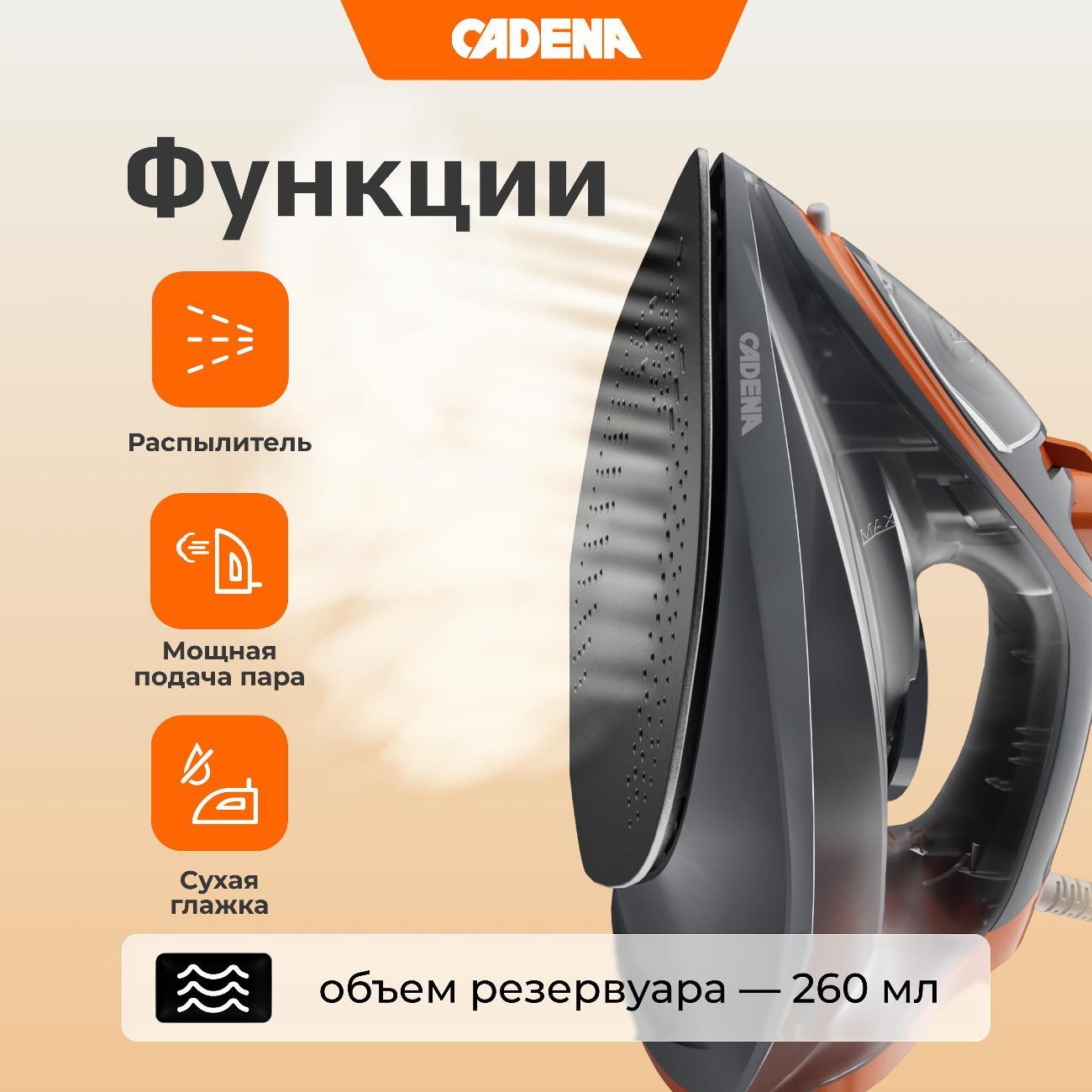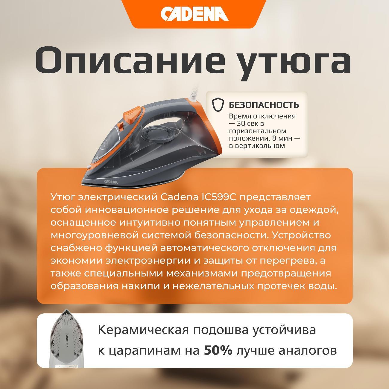 Вы можете купить Утюг Cadena IC599C в магазинах М.Видео по доступной цене. Утюг Cadena IC599C: подробное описание, фото и отзывы реальных покупателей, характеристики, возможность скачать инструкции и подобрать аксессуары.