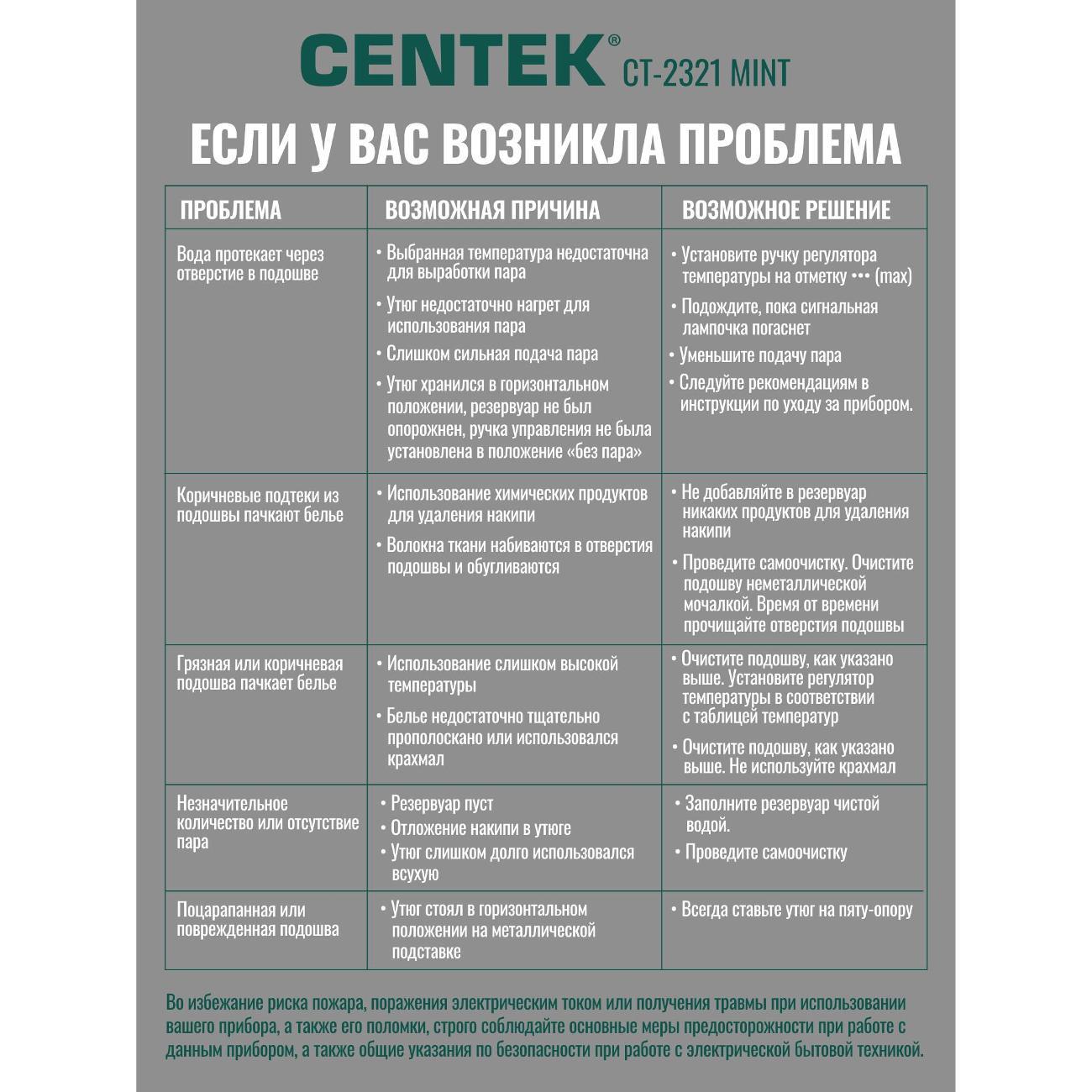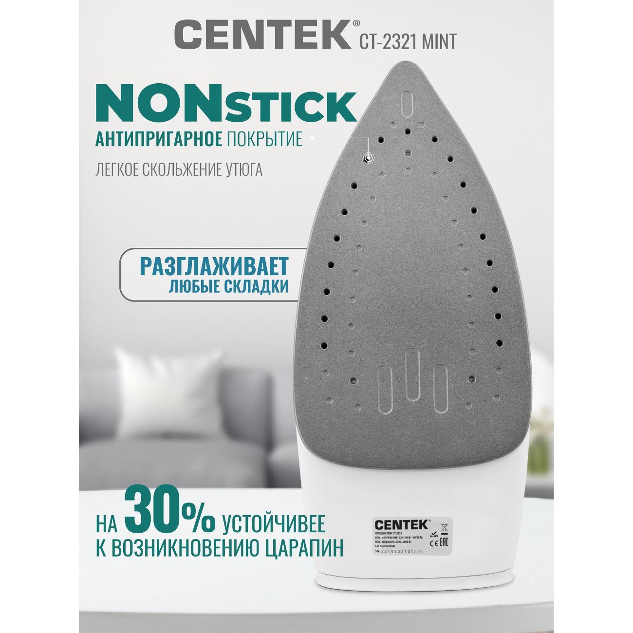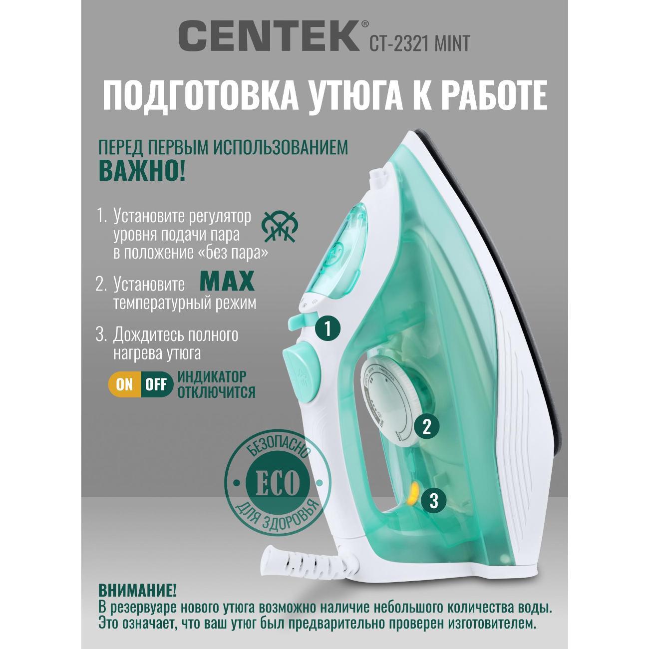 Вы можете купить Утюг Centek CT-2321 MINT в магазинах М.Видео по доступной цене. Утюг Centek CT-2321 MINT: подробное описание, фото и отзывы реальных покупателей, характеристики, возможность скачать инструкции и подобрать аксессуары.