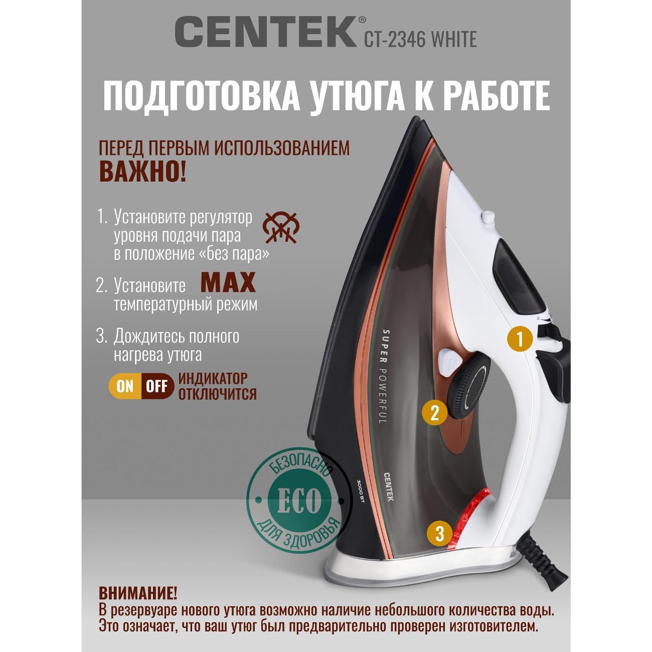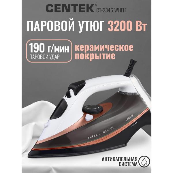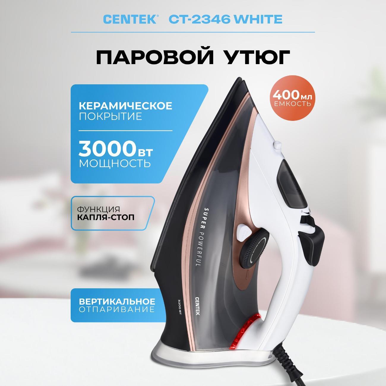 Вы можете купить Утюг Centek CT-2346 White в магазинах М.Видео по доступной цене. Утюг Centek CT-2346 White: подробное описание, фото и отзывы реальных покупателей, характеристики, возможность скачать инструкции и подобрать аксессуары.