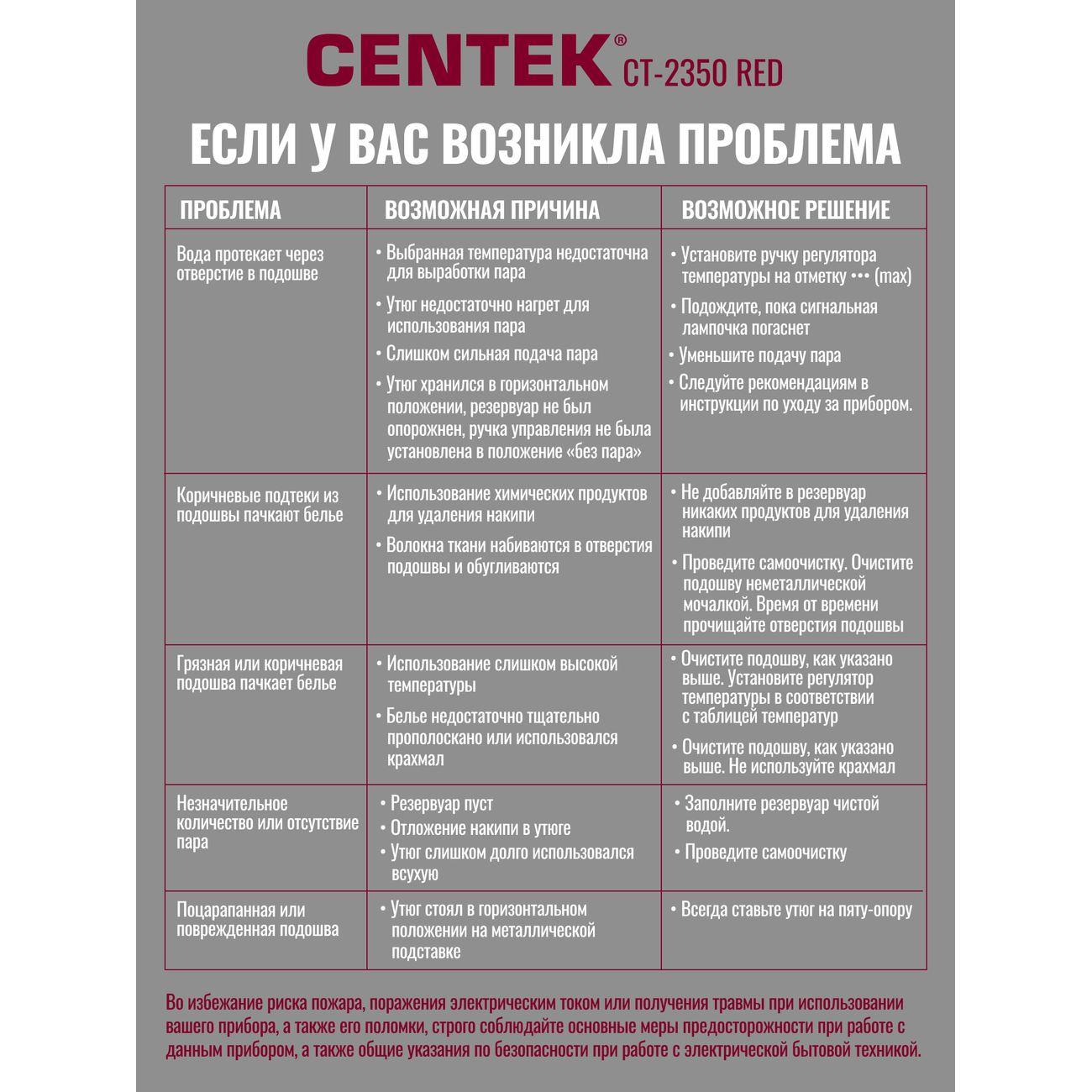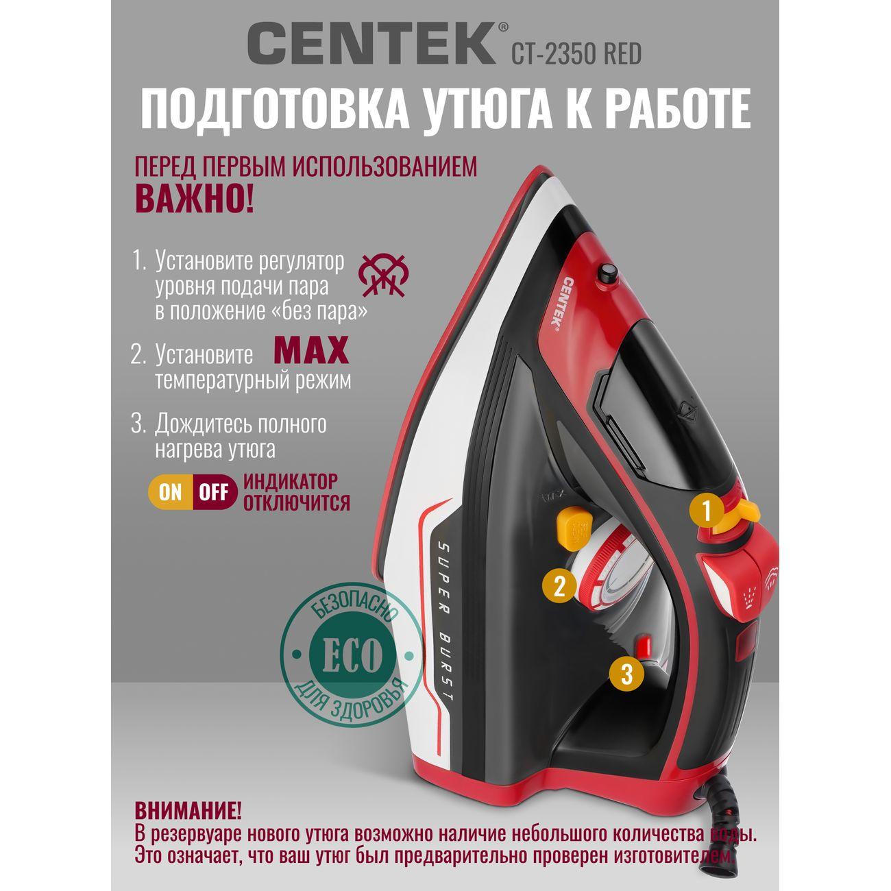 Вы можете купить Утюг Centek CT-2350 красный в магазинах М.Видео по доступной цене. Утюг Centek CT-2350 красный: подробное описание, фото и отзывы реальных покупателей, характеристики, возможность скачать инструкции и подобрать аксессуары.