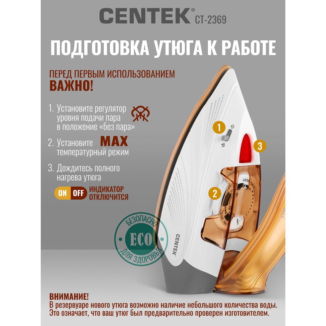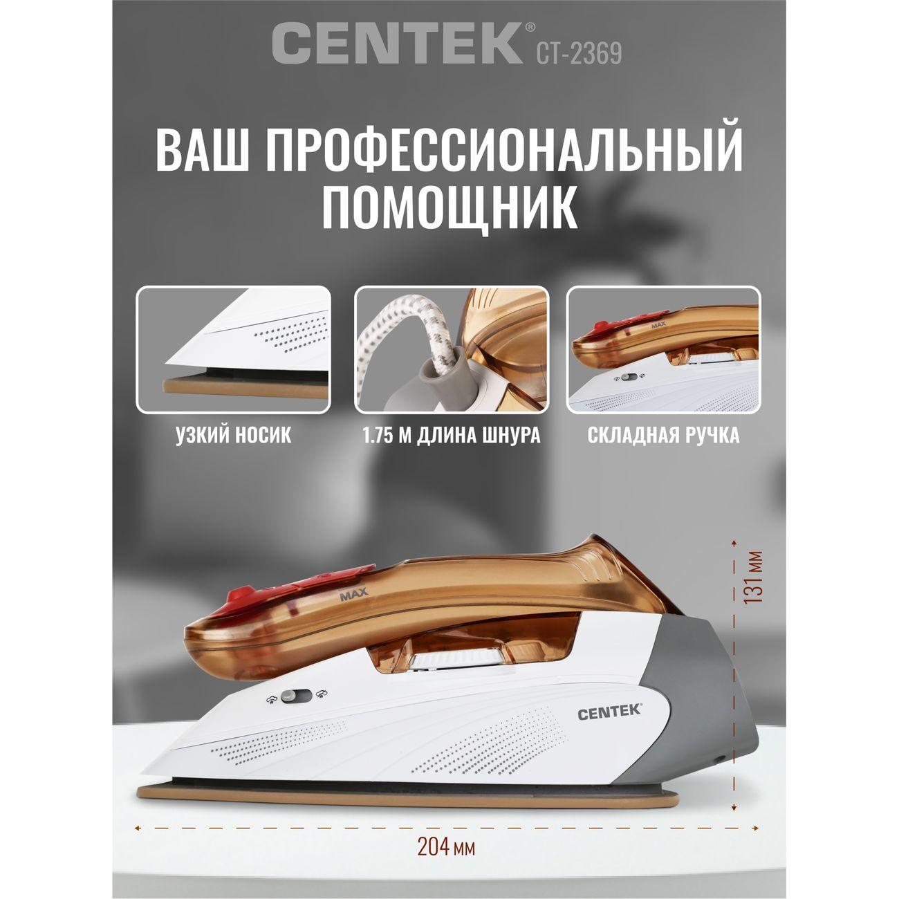 Вы можете купить Утюг Centek CT-2369 в магазинах М.Видео по доступной цене. Утюг Centek CT-2369: подробное описание, фото и отзывы реальных покупателей, характеристики, возможность скачать инструкции и подобрать аксессуары.