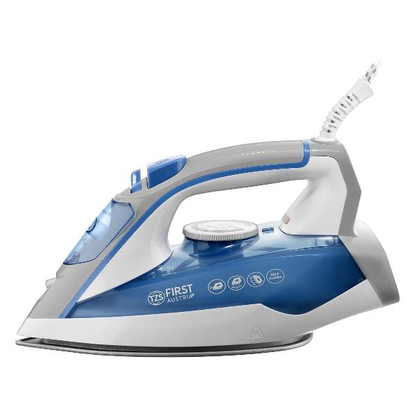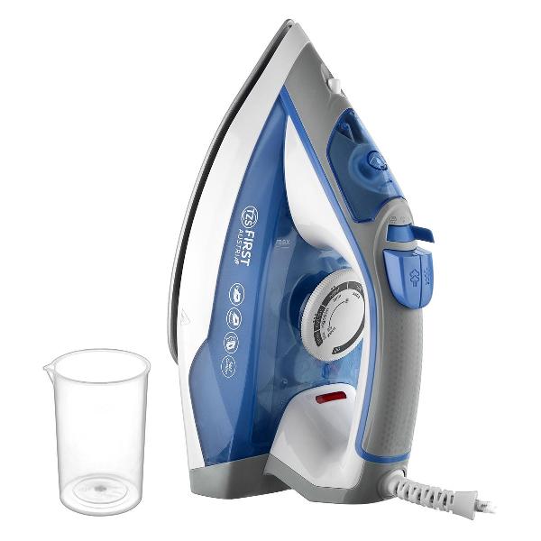 Утюг First FA-5618-6 в корпусе цвета Blue оборудован керамической подошвой с 49 отверстиями для выхода пара, распылителем и отсеком для воды вместимостью 400 мл. Эта модель подходит для вертикального отпаривания с ударом. В комплекте — мерный стакан. В устройство заложена функция самоочистки от накипи.