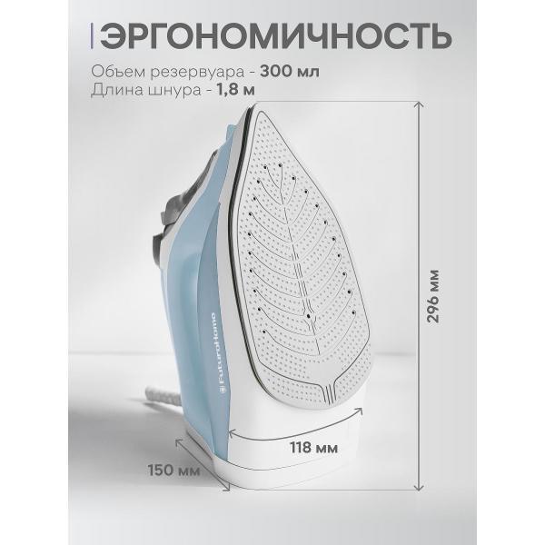 Подошва нагревается до рабочей температуры всего за 38 секунд и легко скользит по материалу. Керамический слой бережно контактирует с деликатной синтетикой и не заминает ткань при движении назад.