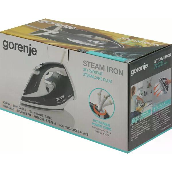 Черный утюг Gorenje SIH2200DGT поддерживает три температурных режима, долив в процессе глажки и нагрев до максимальной температуры 205°С за 1 минуту. Управление представлено механическим переключателем, дополненным индикацией включения и уровня воды. Пластиковый корпус получил подошву AirGlide, прорезиненную ручку, распылитель воды и 1,4-метровый кабель с шаровым креплением для подключения к сети. Устройство мощностью 2200 Вт обеспечивает давление до 3 бар и подачу пара до 30 г/мин. В комплектацию входит мерный стакан.