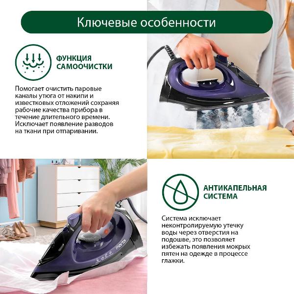 Сам утюг работает безотказно, третий месяц остается в хорошем состоянии, уверен, что он еще долго продержится, кстати, пока не забыл, отличная доставка в вашем магазине. Бытовой прибор должен быть удобным и функциональным, этот как раз такой. Он обладает тремя режимами работы, можно использовать сухого глажения, отпаривания и разбрызгивания воды. Получаю отменный результат независимо от типа ткани. А благодаря функции самоочистки можно не бояться образования накипи.