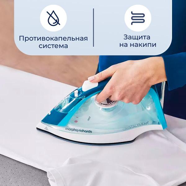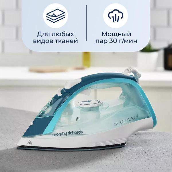 Утюг Morphy Richards 300300 мощностью 2400 Вт наделен шестью рабочими режимами. Предусмотрена возможность вертикального отпаривания, при этом сила парового удара составляет 100 г/мин. Утюг снабжен противокапельной системой и системой самоочистки, что продлит срок его службы.