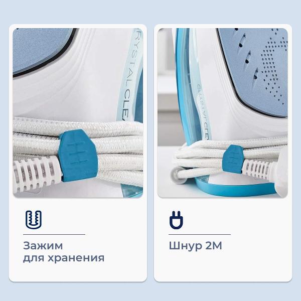 Прозрачный резервуар позволяет доливать воду при необходимости уже в процессе глажки вещей. Длина шнура питания составляет 2 м, чего вполне достаточно для работы с вещами любого размера, в том числе крупногабаритного постельного белья, пледов. В случае перегрева прибор автоматически отключается.