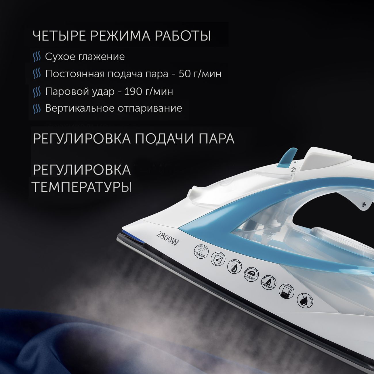Устройство оснащено керамической подошвой с защитным покрытием, обеспечивающим плавное скольжение. Шнур длиной три метра с шарнирным соединением дает свободу перемещения. Резервуар объемом 300 мл рассчитан на продолжительную работу без долива.