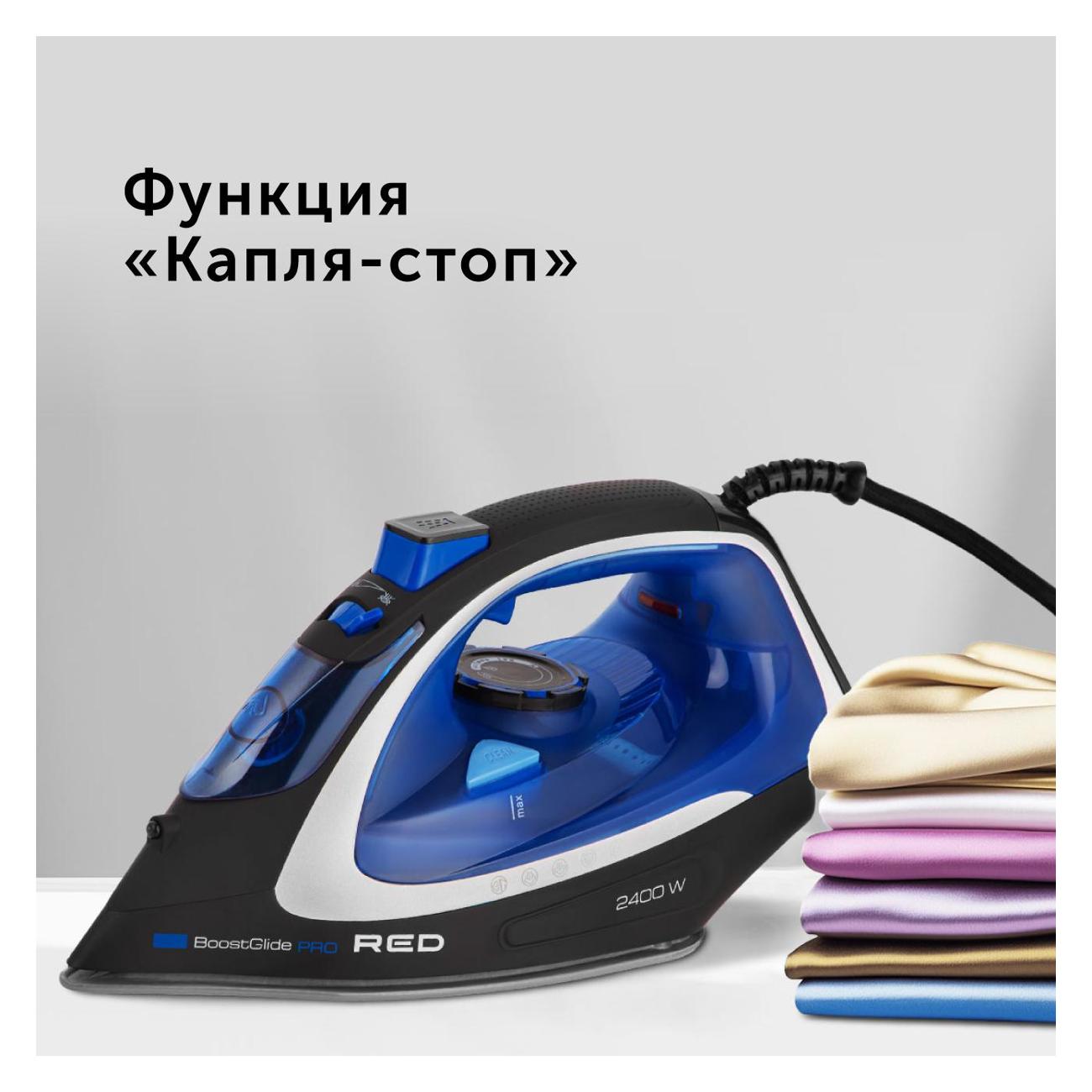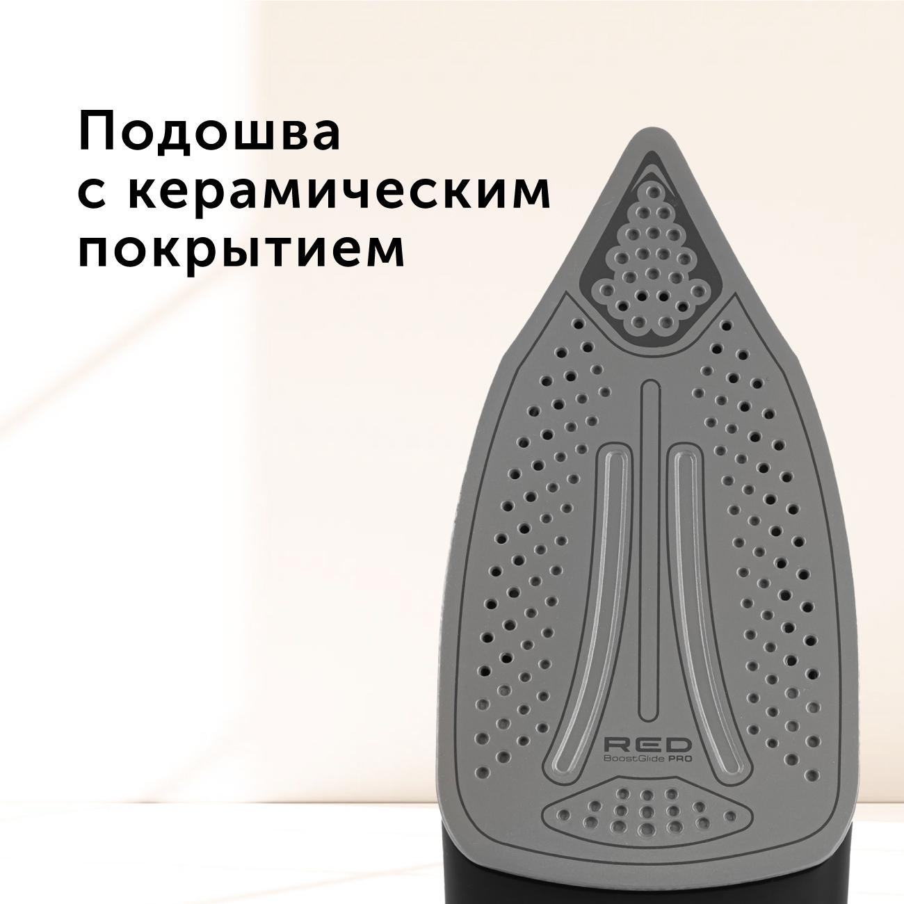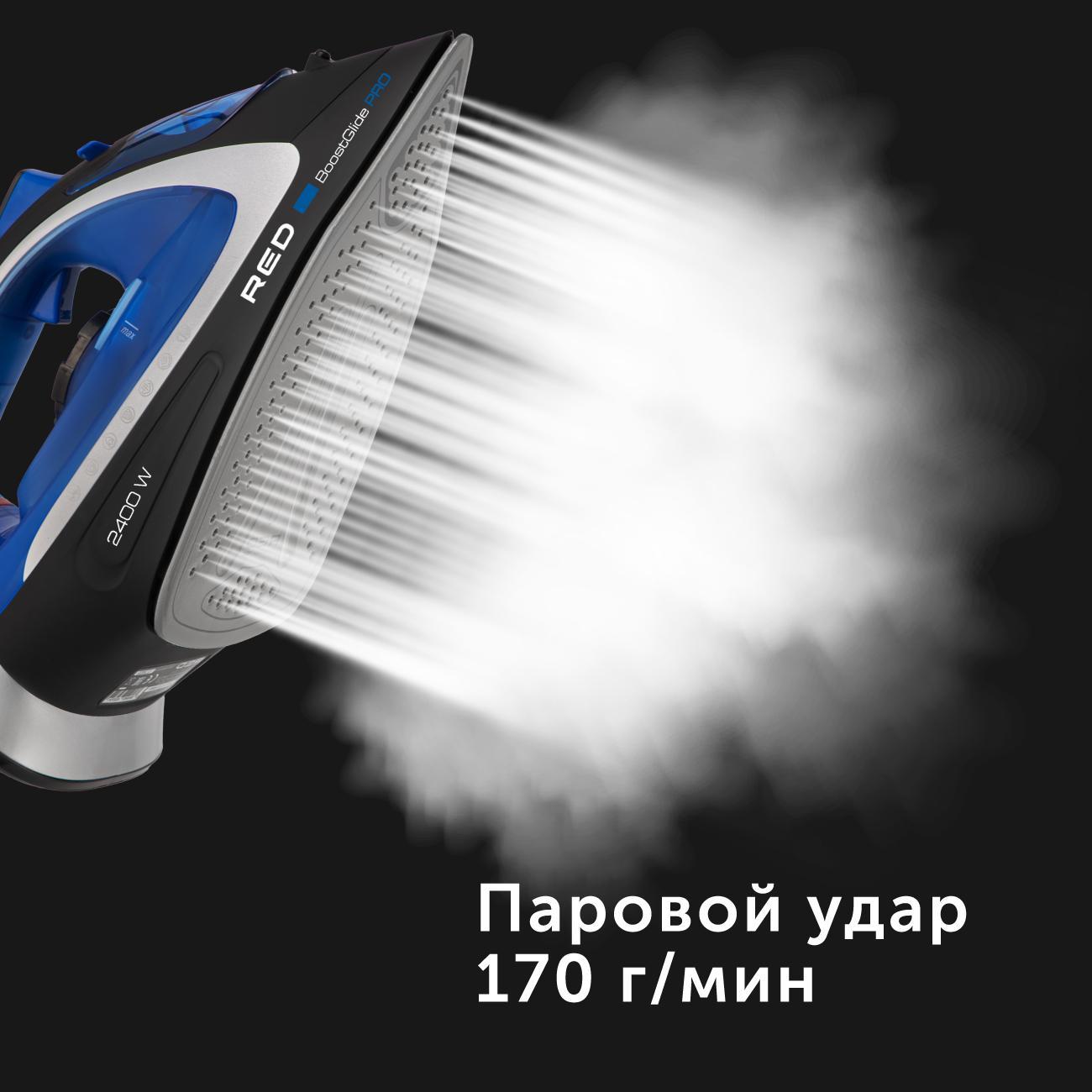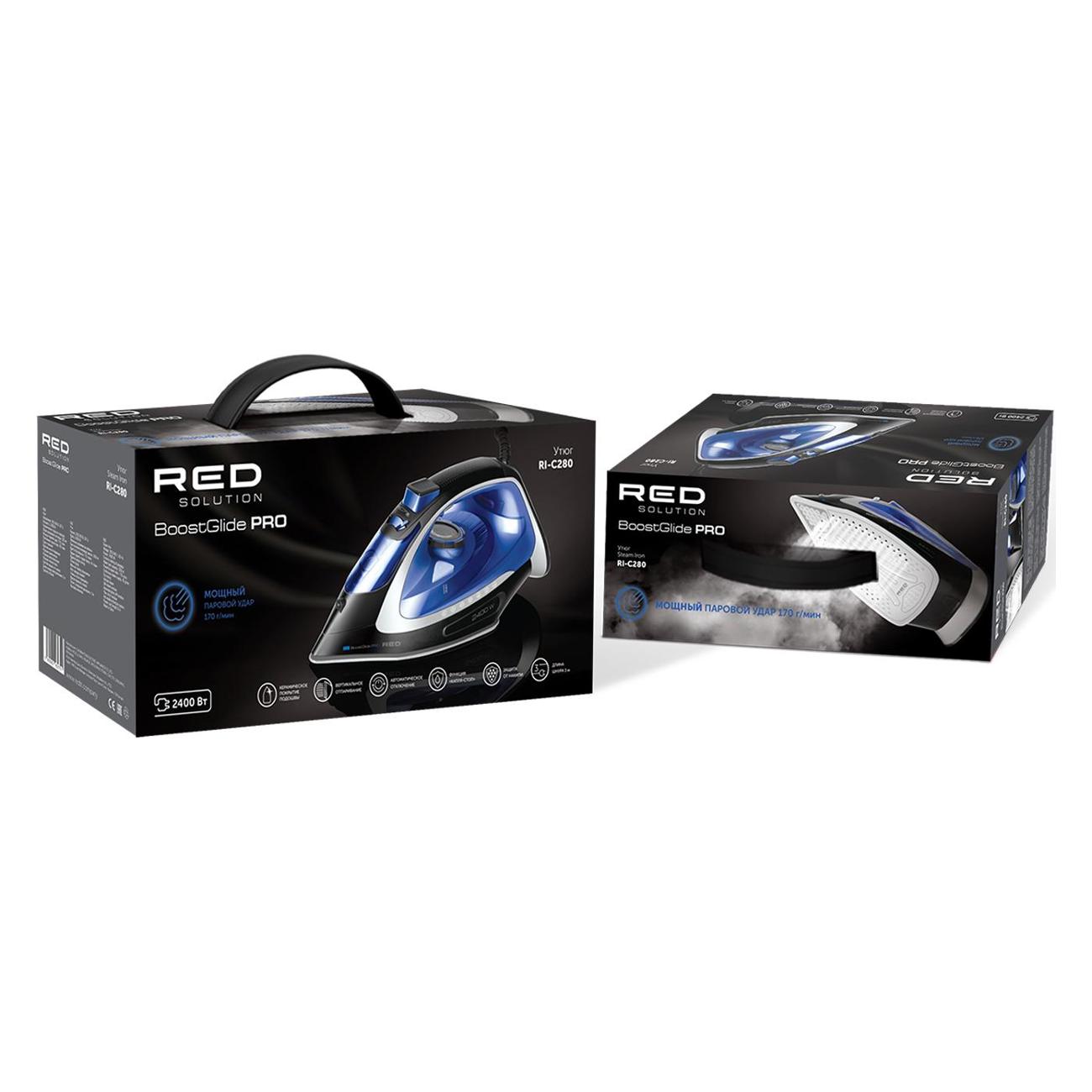Утюг Red Solution RI-C280 работает в четырех температурных режимах. Настройки устанавливаются с помощью механического поворотного переключателя. Прибор подходит для вертикального отпаривания: интенсивность парового удара — 170 г/мин.