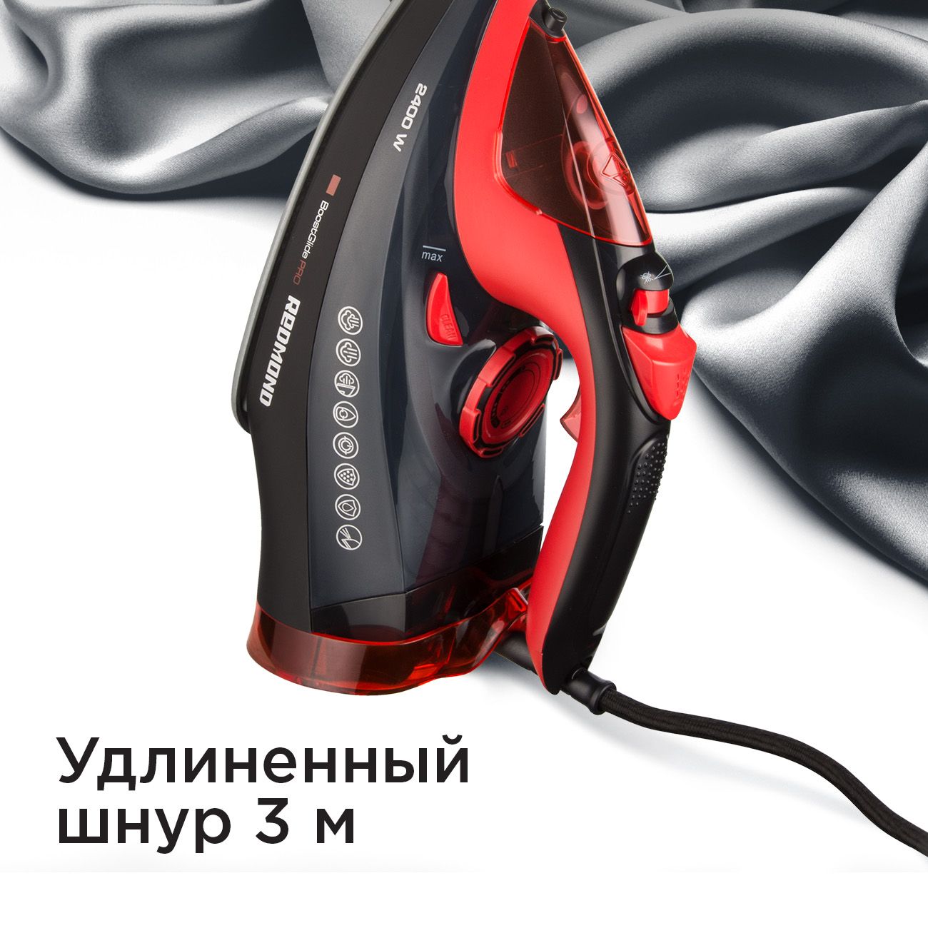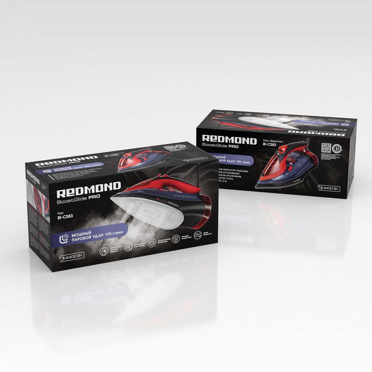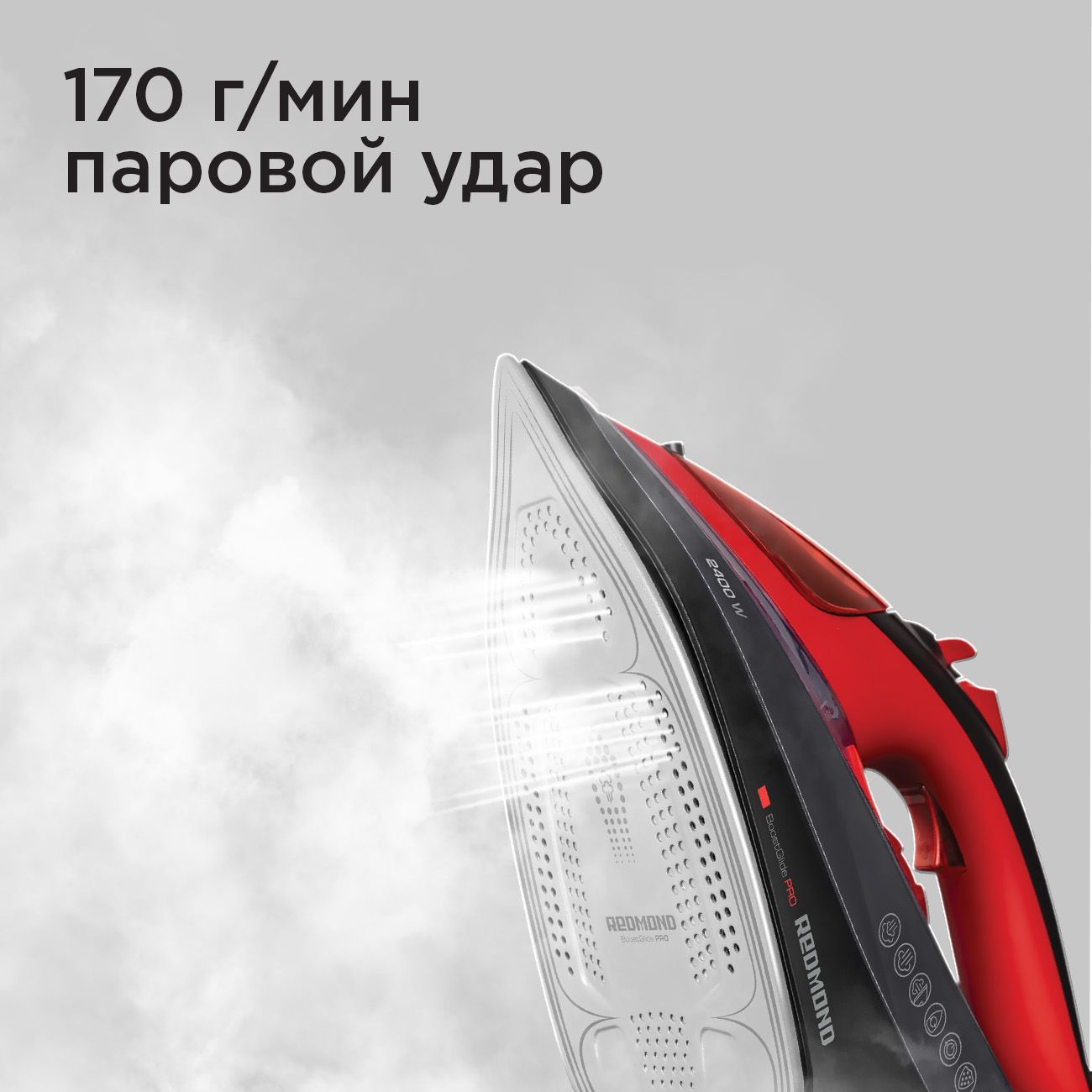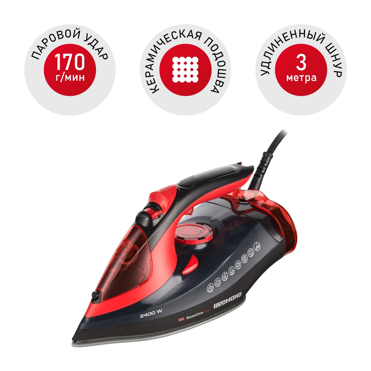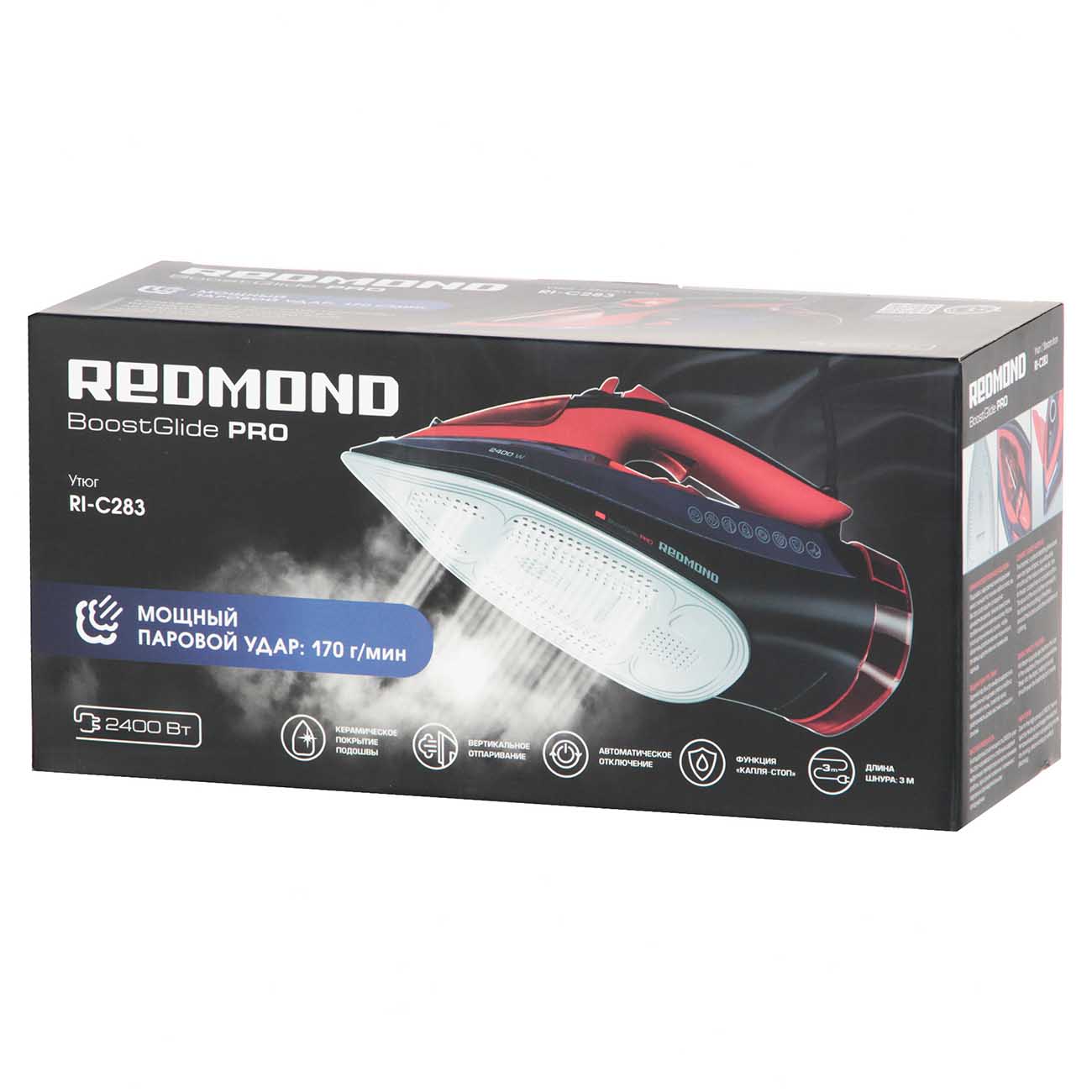 Утюг Redmond RI-C283 легко справляется с самыми сложными складками на тканях любых видов, от тонкого шёлка для плотного льна. Эффективность обеспечивают высокая мощность 2400 Вт, постоянная подача пара (45 г/мин) и паровой удар (170 г/мин), которые устраняют самые сложные заломы.