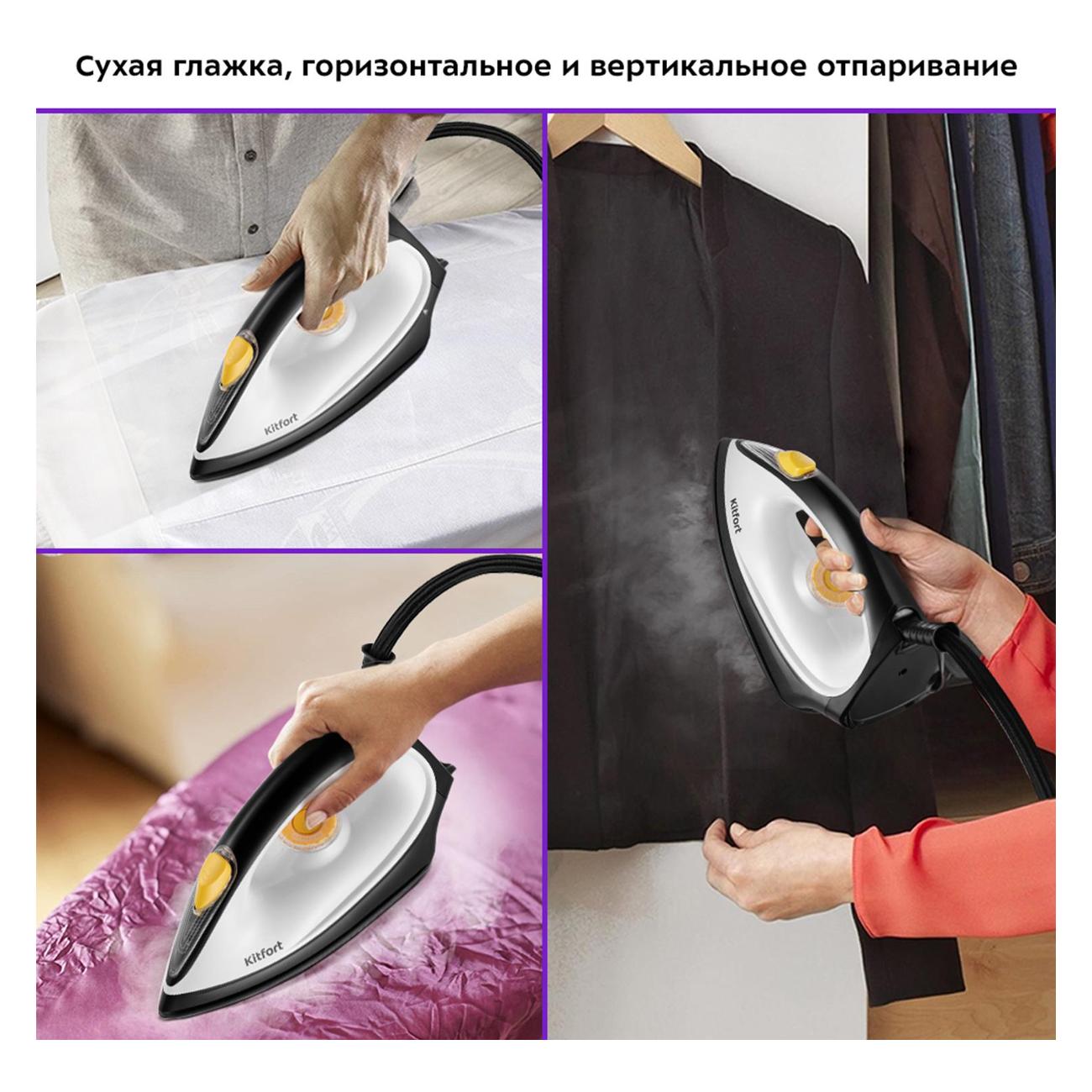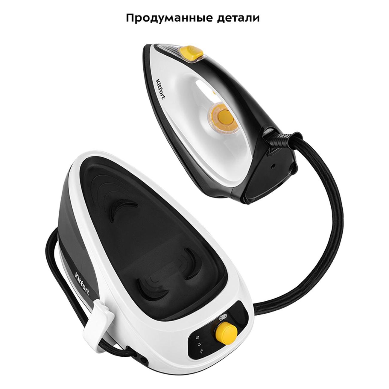 Компактный парогенератор Kitfort КТ-9148 обладает габаритами 34,5х36,5х21,5 см и весит 2,3 кг. Модель выполнена в бело-черном цвете. Корпус изготовлен из пластика, подошва утюга — алюминиевая. Используется как для работы в вертикальном, так и горизонтальном положении.