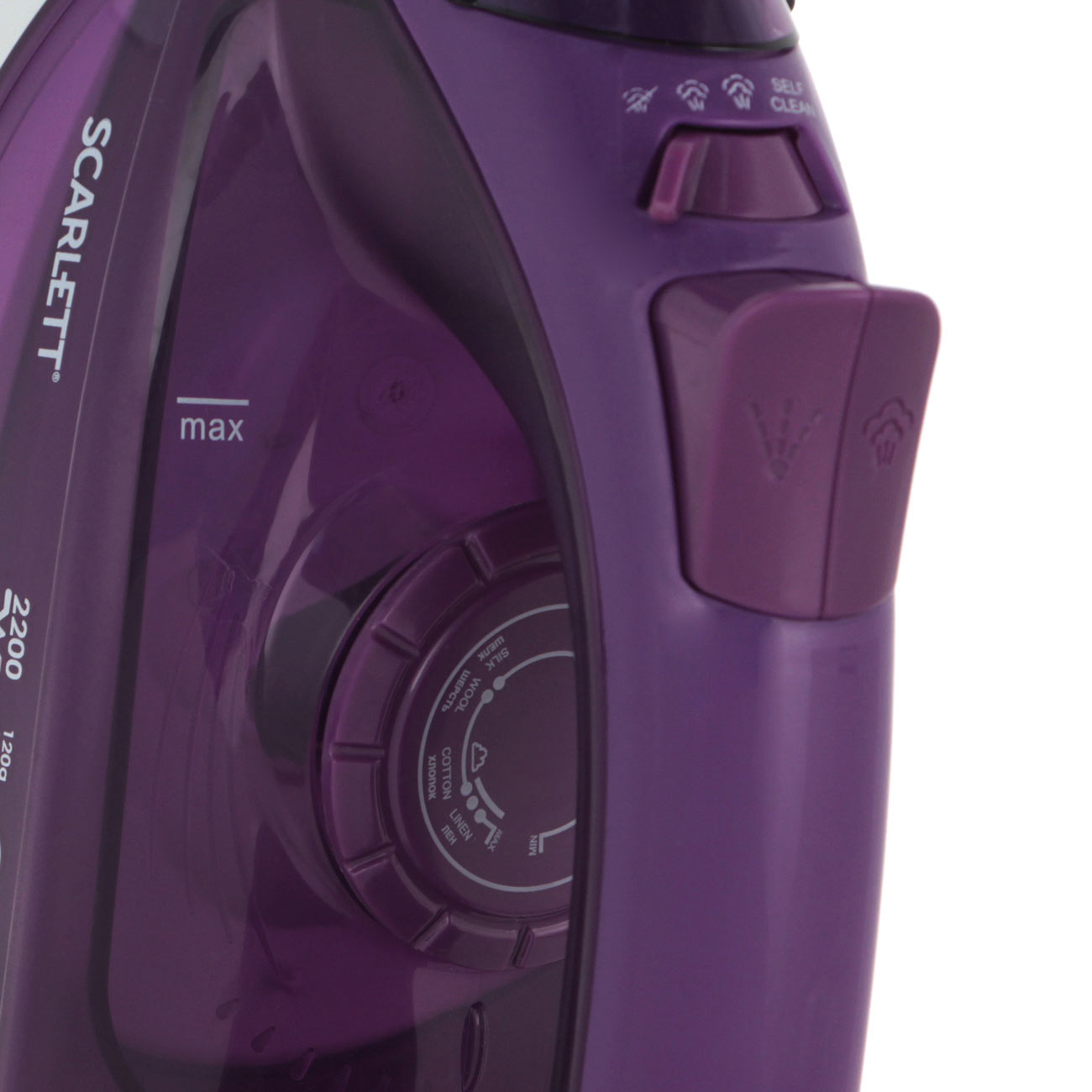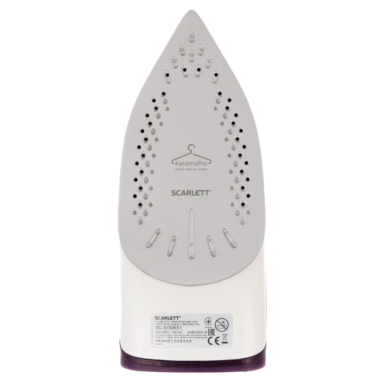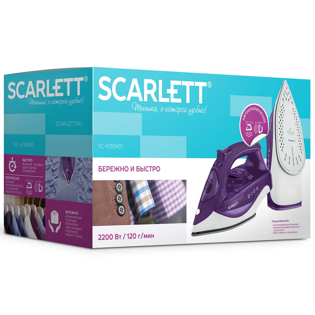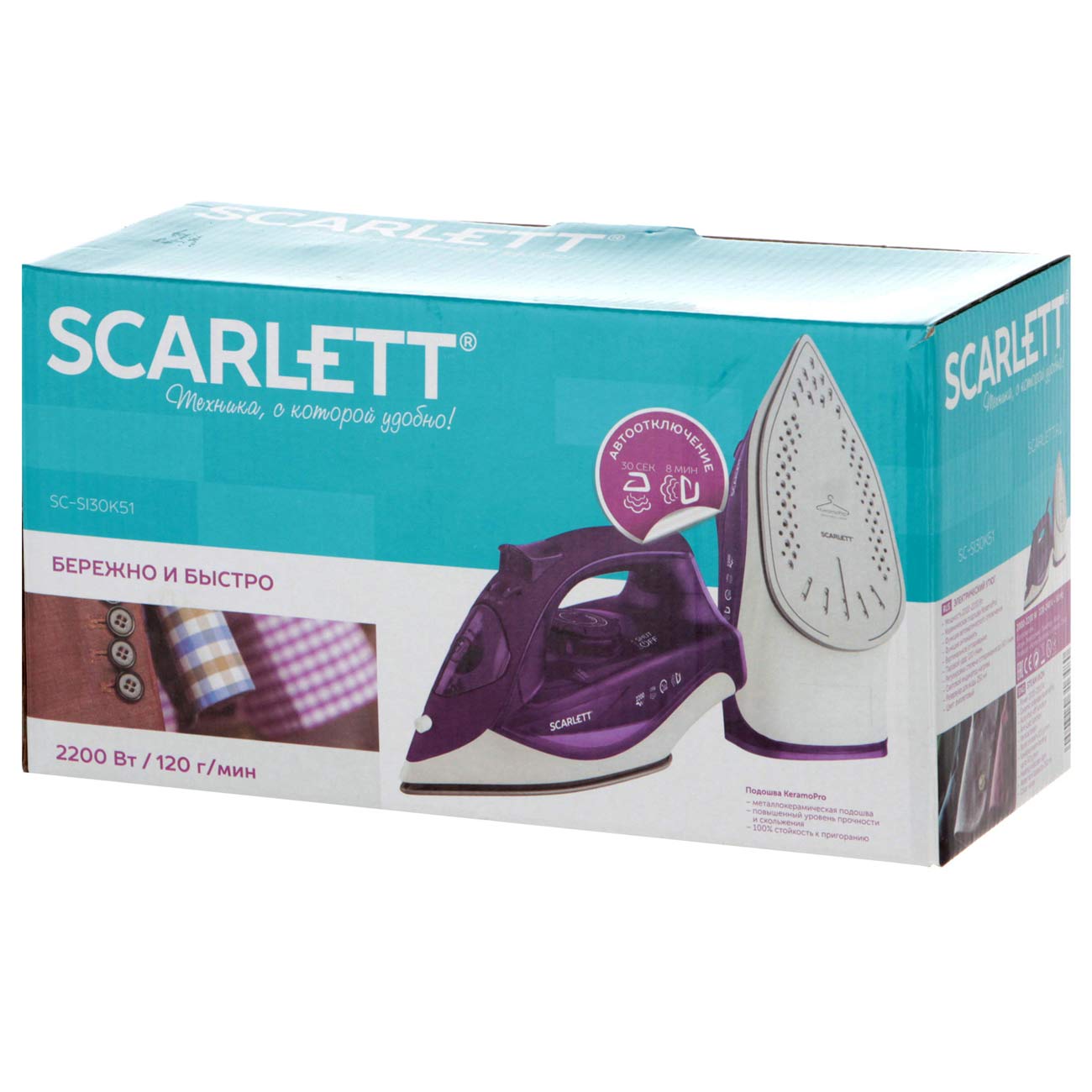 Утюг Scarlett SC-SI30K51 снабжён подошвой KeramoPro. Благодаря очень гладкому керамическому покрытию она быстро и равномерно прогревается, легко скользит в любом направлении и обеспечивает бережный уход за тканями любых типов, от деликатного шёлка, до неприхотливого хлопка.