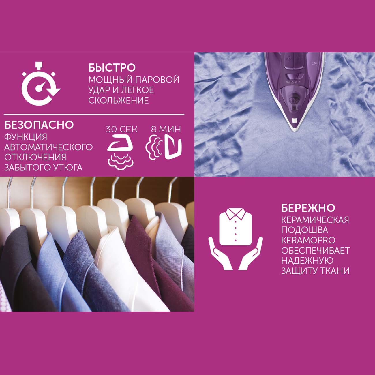 За безопасность отвечает система автоматического отключения. Она срабатывает, если утюг не используется 30 секунд в горизонтальном положении и восемь минут в вертикальном.
