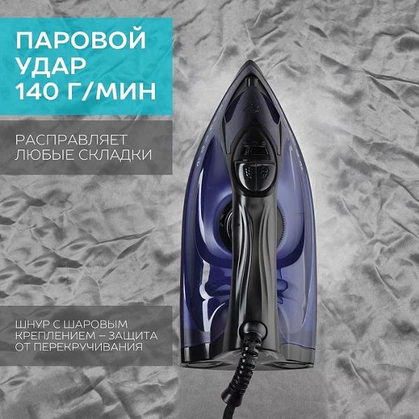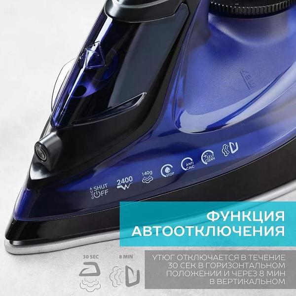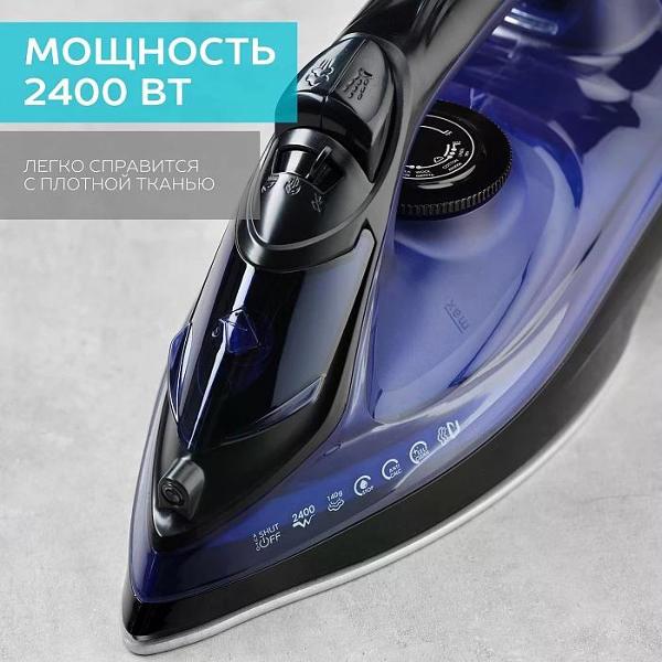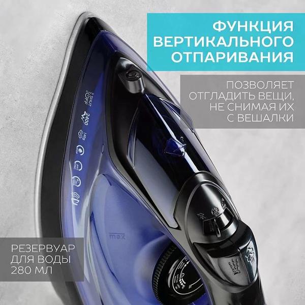 Основная часть корпуса утюга сделана из прочного пластика, в качестве материала подошвы использована керамика KeramoPro. В набор входит мерный стакан. Длина кабеля питания равна 1,8 м. Рабочее напряжение составляет 220 В. Предельный показатель энергопотребления не превышает 2400 Вт. Доступна функция вертикального отпаривания.