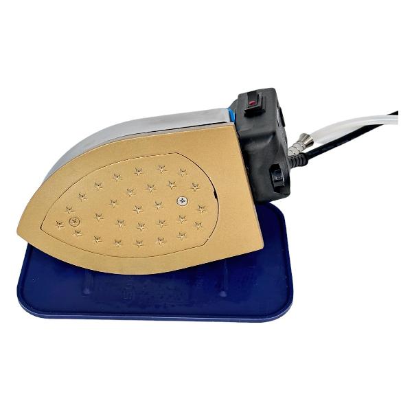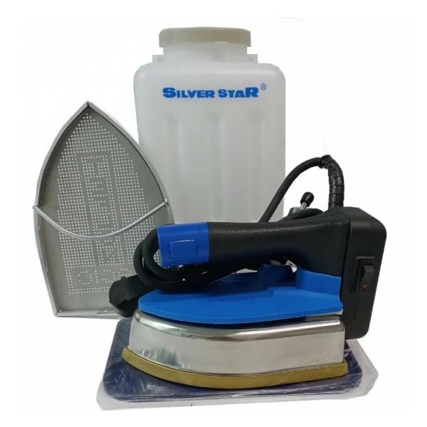 Утюг Silver Star ES-999 с толстой подошвой из металла подходит при эксплуатации в ателье, школе шитья, химчистке или прачечной. Модель оснащена функциями автоматизированного контроля оптимальной температуры, вертикального отпаривания, ионизации пара (интенсивность подачи — до 100 г/мин), противокапельной системой. В резервуар для воды во время работы можно доливать жидкость, объема хватает на 120 мин работы. Для защиты устройства предусмотрен стержень от накипи.