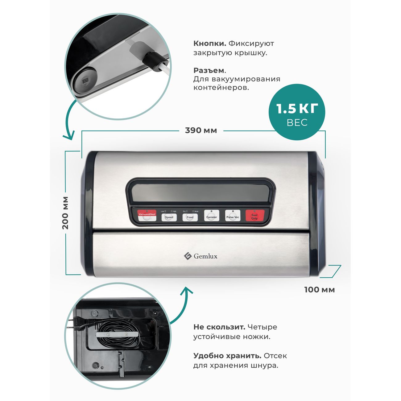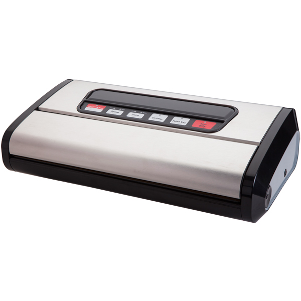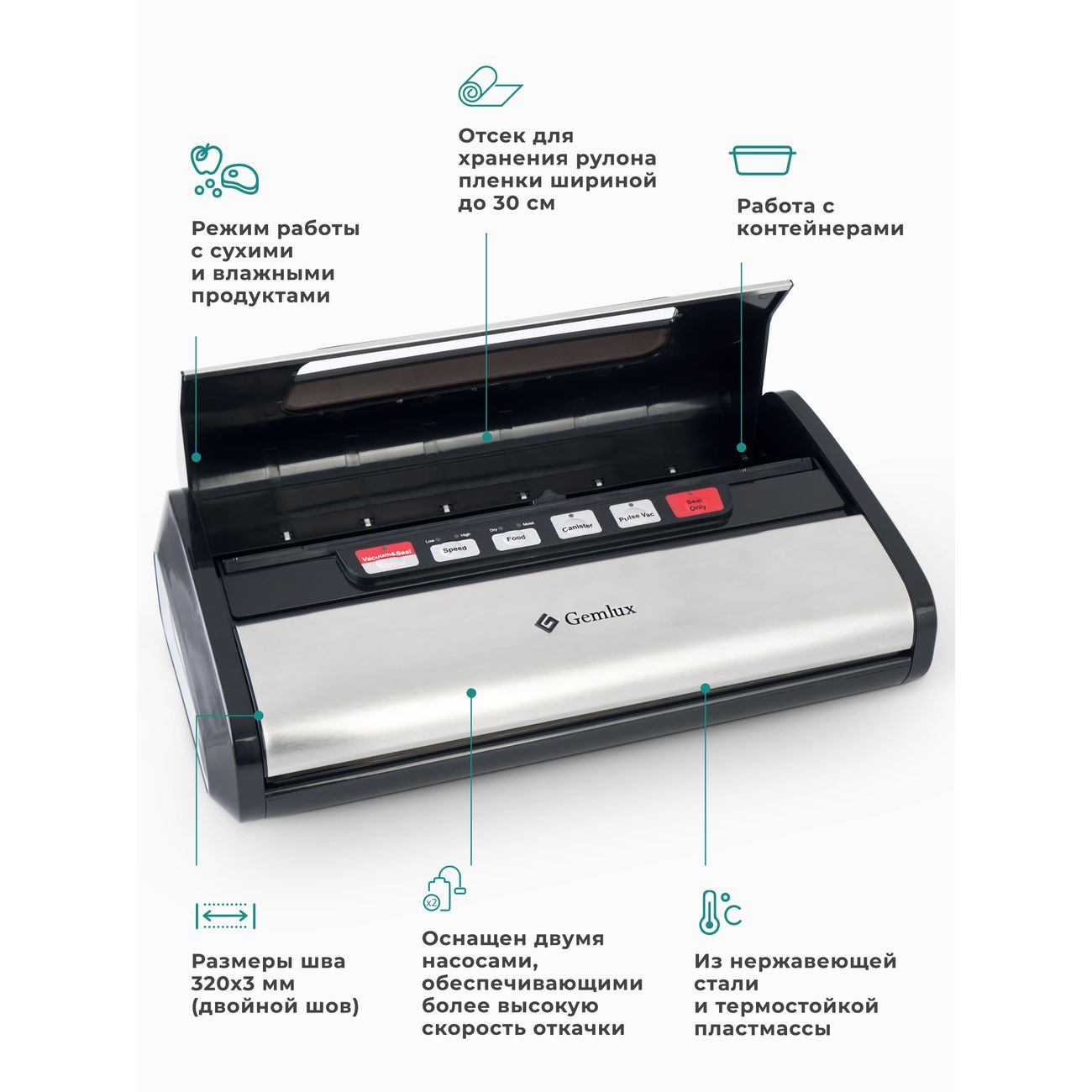 Вакуумный упаковщик Gemlux GL-VS-779S оснащен двумя насосами. Устройство бескамерное. Корпус упаковщика сделан из пластика, а откидная крышка и передняя панель — из нержавеющей стали. Модель выполняет следующие операции: вакуумирование и запаивание пластиковых пакетов, вакуумирование продуктов в контейнерах, а также запаивание пакетов без высасывания воздуха. Есть возможность выбрать скорость откачки воздуха. Устройство способно нарезать пакеты из рулона с помощью встроенного ножа. Ширина запаечного шва составляет 3 мм. Вакуумный упаковщик работает от электрической сети и потребляет 165 Вт. Управление осуществляется электронно: на передней панели располагается дисплей и кнопки управления. Модель предназначена для настольного размещения.