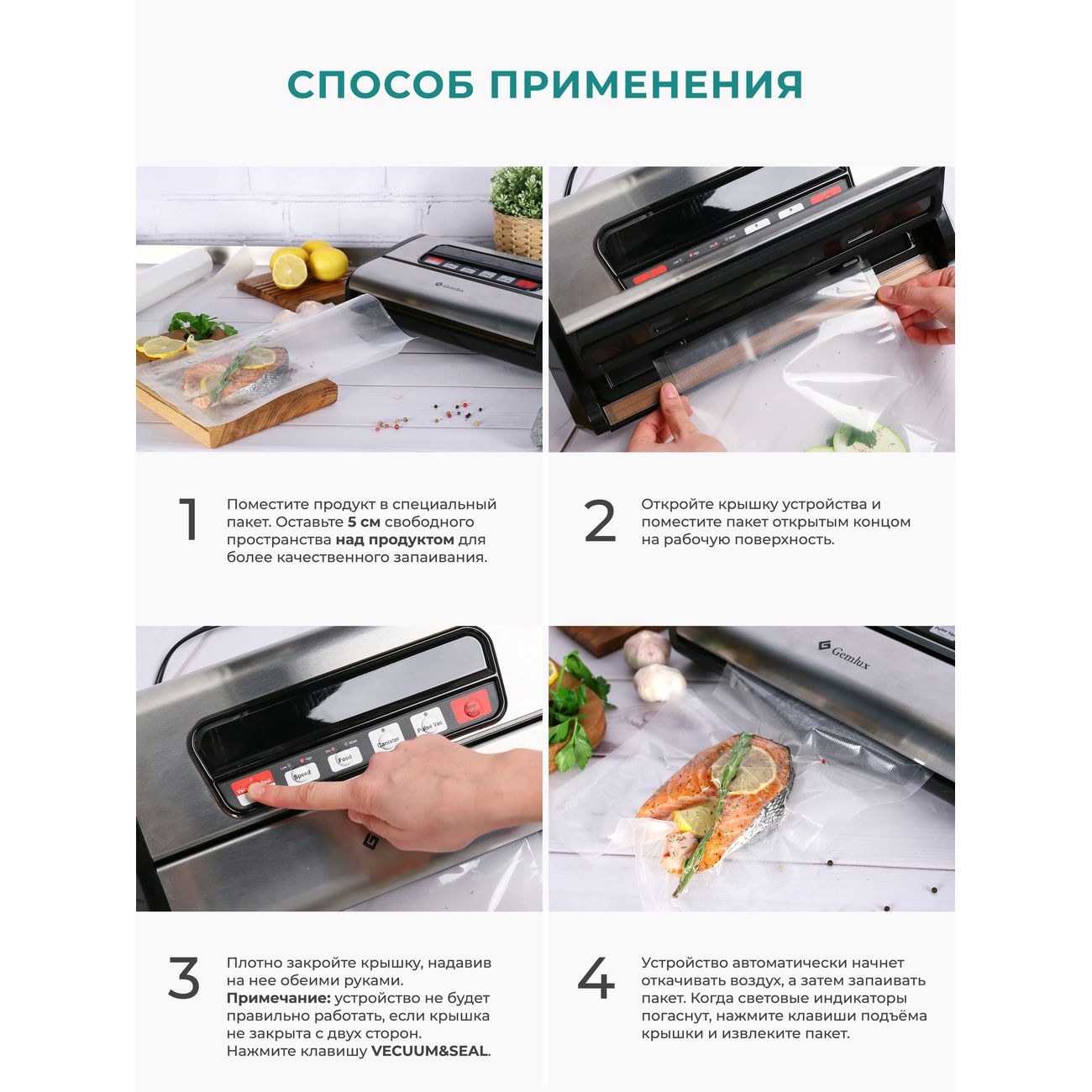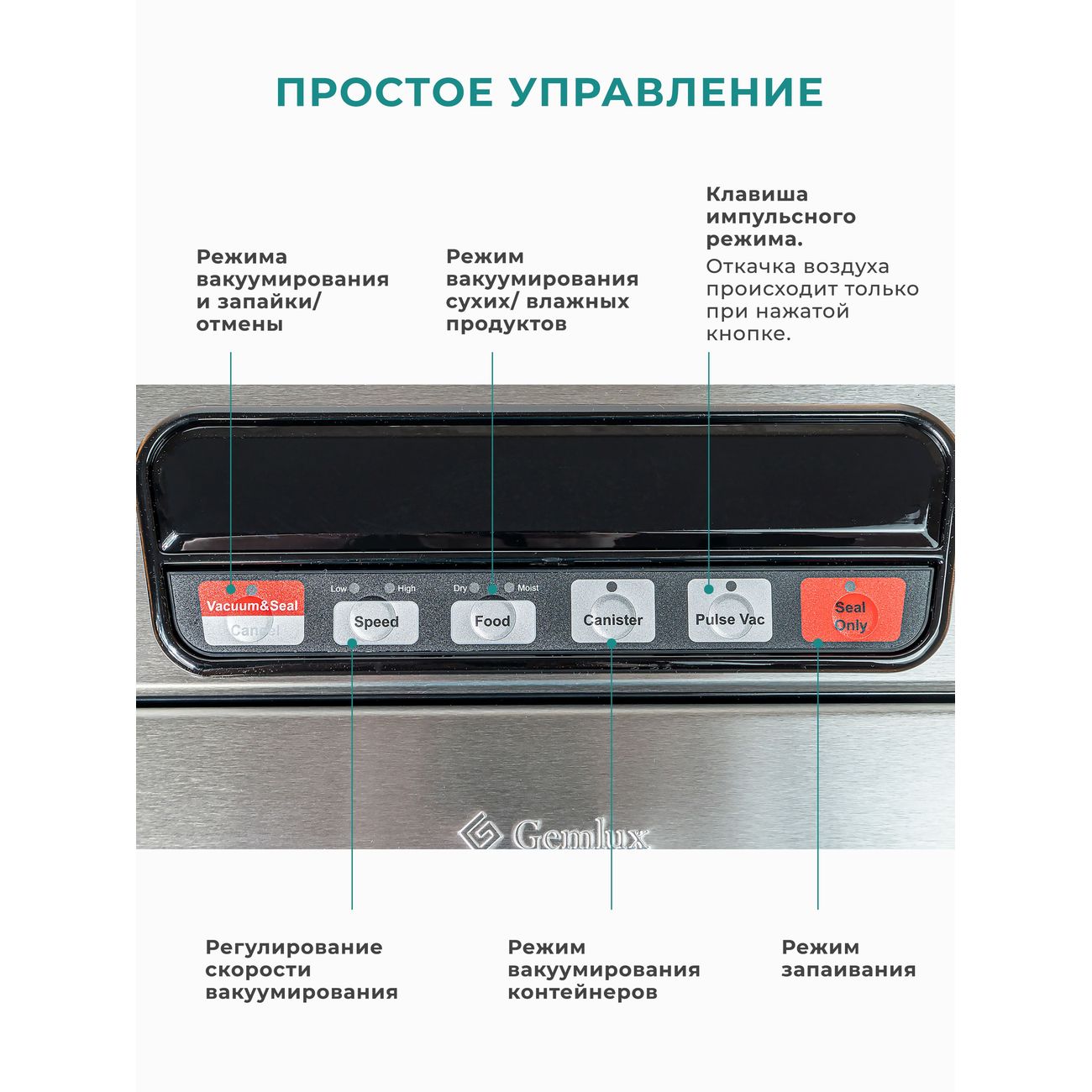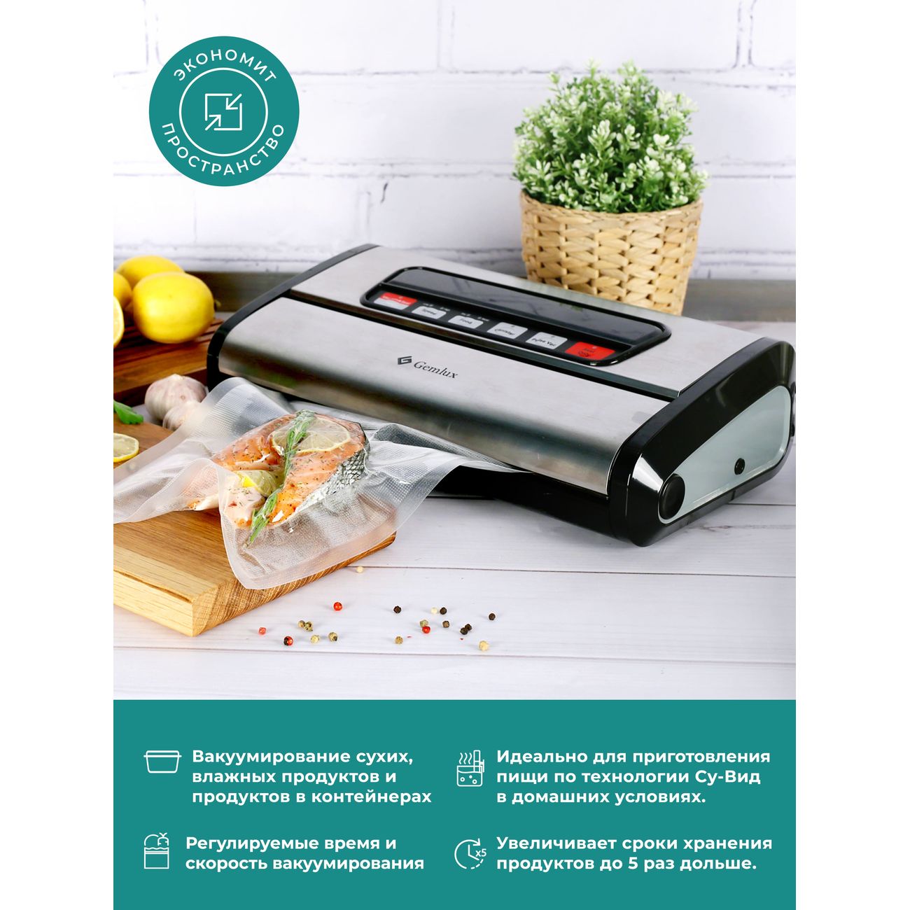 Вакуумный упаковщик Gemlux GL-VS-779S оснащен двумя насосами. Устройство бескамерное. Корпус упаковщика сделан из пластика, а откидная крышка и передняя панель — из нержавеющей стали. Модель выполняет следующие операции: вакуумирование и запаивание пластиковых пакетов, вакуумирование продуктов в контейнерах, а также запаивание пакетов без высасывания воздуха. Есть возможность выбрать скорость откачки воздуха. Устройство способно нарезать пакеты из рулона с помощью встроенного ножа. Ширина запаечного шва составляет 3 мм. Вакуумный упаковщик работает от электрической сети и потребляет 165 Вт. Управление осуществляется электронно: на передней панели располагается дисплей и кнопки управления. Модель предназначена для настольного размещения.