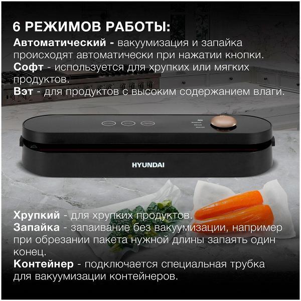 Вы можете купить Вакуумный упаковщик Hyundai HY-VA3003 (110 Вт черный/серый) в магазинах М.Видео по доступной цене. Вакуумный упаковщик Hyundai HY-VA3003 (110 Вт черный/серый): подробное описание, фото и отзывы реальных покупателей, характеристики, возможность скачать инструкции и подобрать аксессуары.