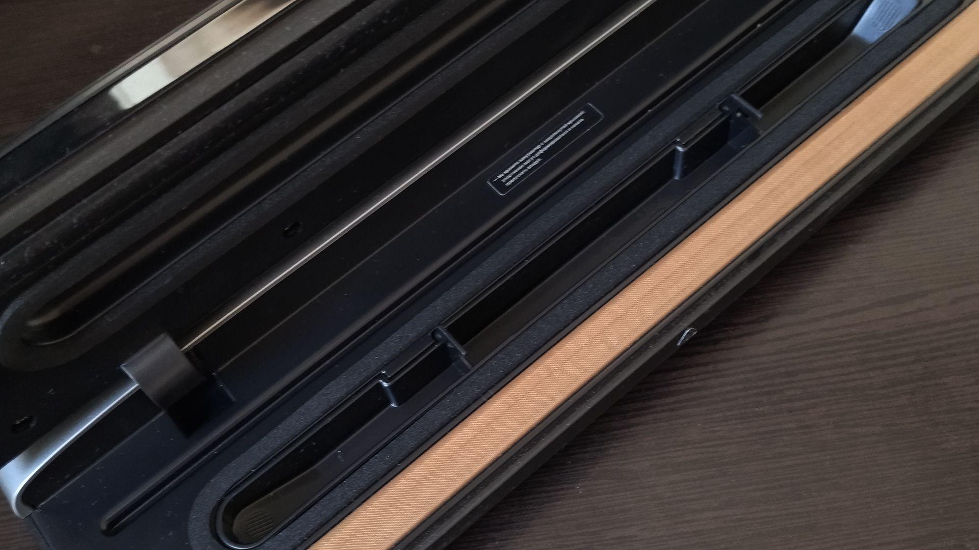 + Можно использовать не оригинальные пакеты или рулонную пленку, ширина прибора позволяет вакуумировать пакеты разных размеров, в зависимости от выбранных продуктов (кстати в комплекте отличный резак, которым очень удобно отрезать нужную длину, если делать пакеты из рулонной пленки).