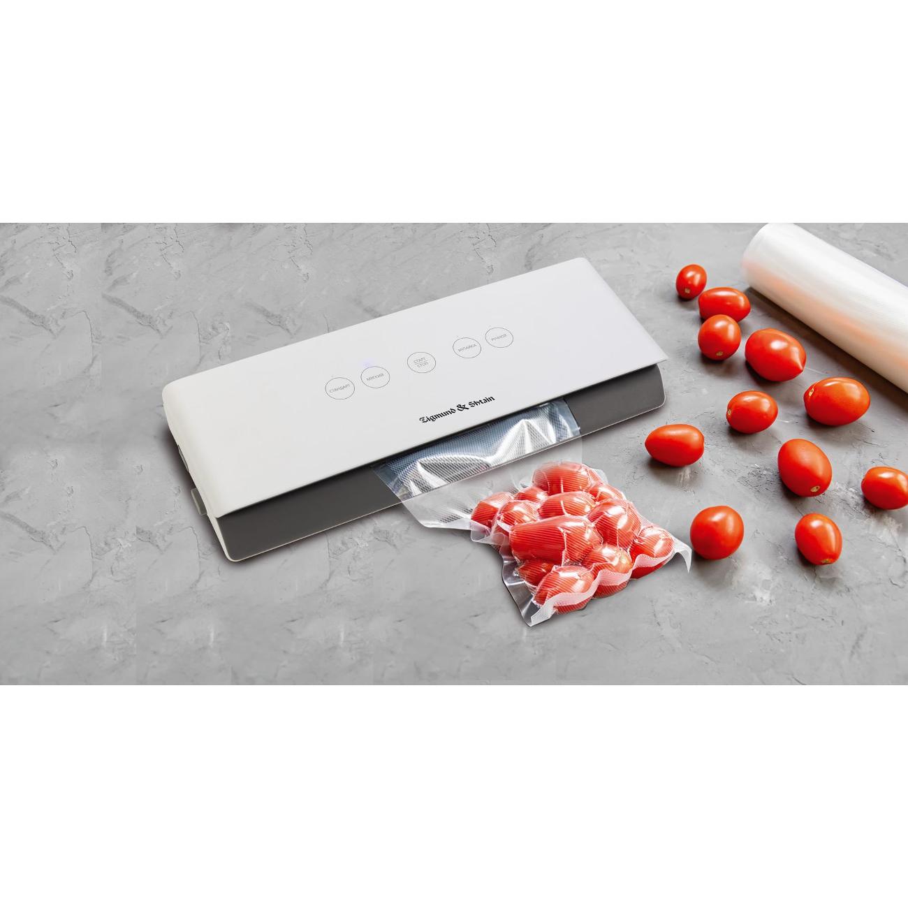 Вакуумный упаковщик Zigmund & Shtain VS-506 с кнопочным управлением работает в трех режимах. Максимальная ширина упаковки — 18 см. Корпус белого цвета сделан из пластика, на нем предусмотрена клавиша Stop. Мощность — 110 Вт. Размеры — 9х18х43 см, вес — 1,1 кг.