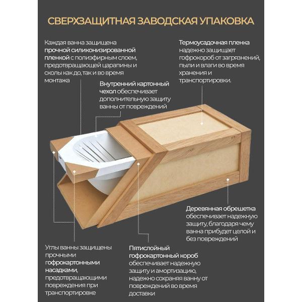 Ванная выполнена из качественного европейского акрила толщиной 4-5 мм, который отличается прочностью и стойкостью к механическим повреждениям, царапинам и деформациям. Это гарантирует долговечность и сохранение первоначального внешнего вида на протяжении многих лет.