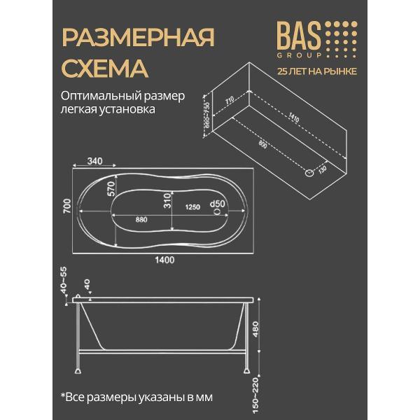 Акриловая ванна BAS «Эдеса» 140×70 см — практичное решение для ванной комнаты. Прямоугольная форма 1400×700 мм и лаконичный дизайн делают изделие подходящим для современных интерьеров.