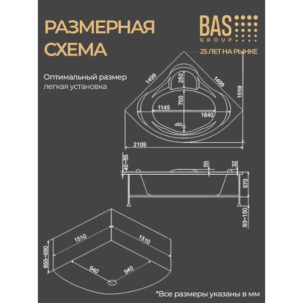 Акриловая угловая ванна BAS "Эльминьо" размеры 1500×1500 мм выполнена из европейского гомогенного акрила толщиной 4-5 мм, покрытого антибактериальным слоем «Antibac». Встроенное сидение и мягкий наклон спинки с подголовником обеспечивают комфортное положение, снижают нагрузку на позвоночник и повышают удобство при использовании. Поверхность быстро очищается, сохраняет глянец и устойчивость к царапинам, ударам и трещинам, что обеспечивает долгий срок службы. Горизонтальные наклонные поверхности способствуют быстрому и эффективному стеканию воды, поддерживая чистоту внутри ванны. Высокие теплоизоляционные свойства создают ощущение тепла и уюта во время водных процедур. Обработанное противоскользящее дно повышает безопасность эксплуатации, особенно в семьях с детьми и пожилыми. В комплект входит регулируемый по высоте каркас, что облегчает монтаж и сокращает время установки. Конструкция и материалы гарантируют долгую эксплуатацию, сохранение белоснежного цвета и устойчивость к механическим повреждениям. Размеры и форма изделия позволяют оптимально использовать пространство в ванной комнате, создавая функциональный и эстетичный интерьер.