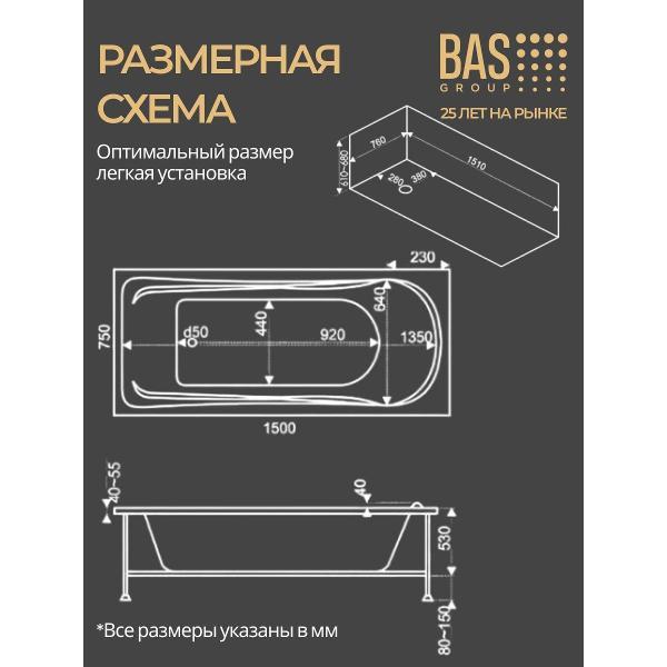 Акриловая ванна BAS «Танго» 150×75 см поставляется в комплекте, включающем полностью собранный регулируемый по высоте каркас. Размер конструкции оптимален для современных ванных комнат, обеспечивая комфортное купание при минимальных затратах пространства. В изделии использован европейский гомогенный акрил толщиной 4-5 мм с антибактериальным слоем «Antibac», который защищает поверхность от бактерий, устойчив к царапинам и трещинам, а глянцевая отделка сохраняет привлекательный внешний вид надолго.