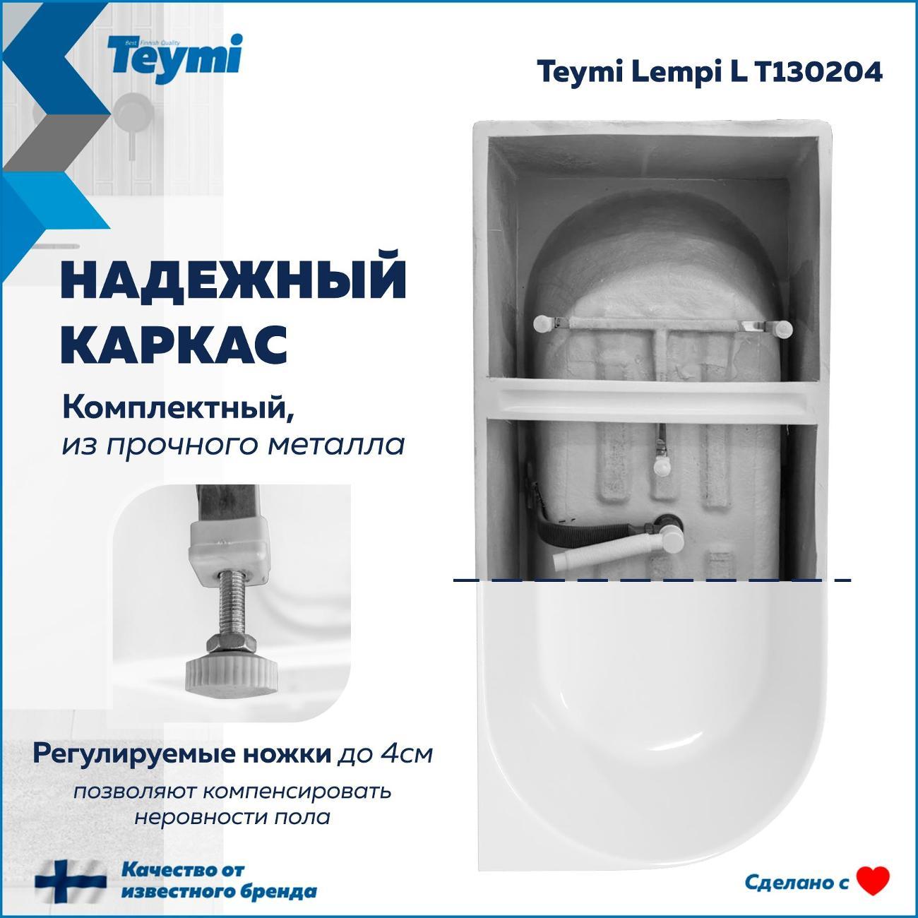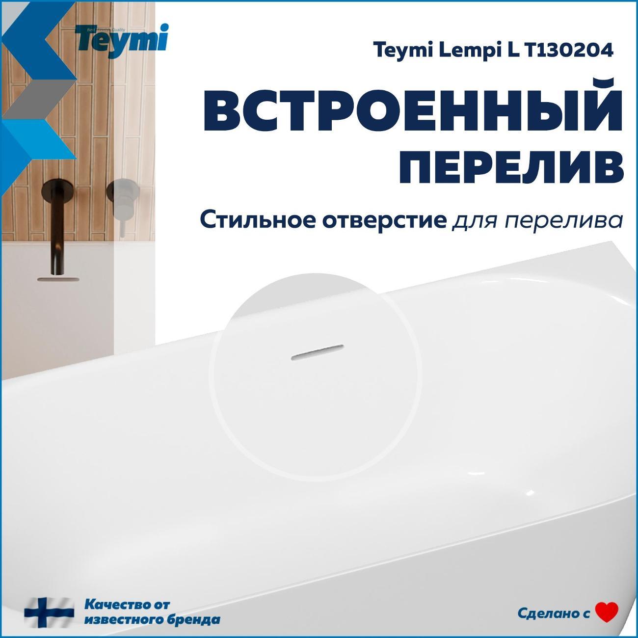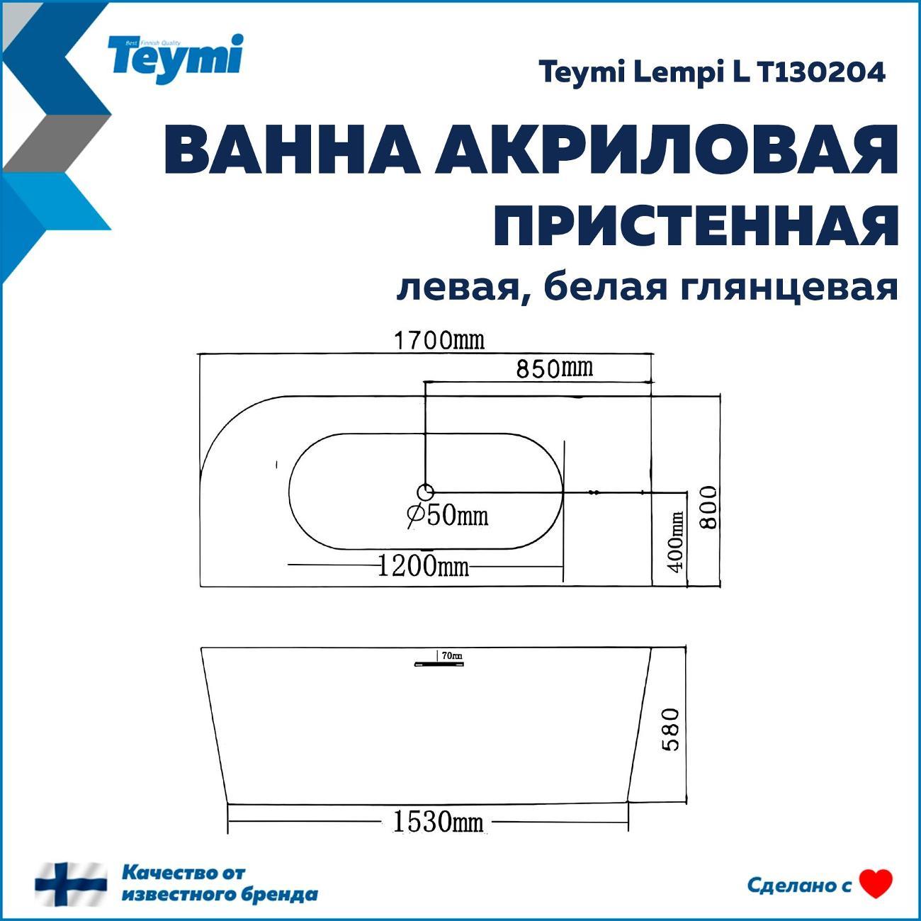 Акриловая ванна Teymi Lempi L 170x80 (левая) T130204 Превратите вашу ванную комнату в пространство скандинавского спокойствия и стиля с ванной Teymi Lempi L. Эта модель от финского бренда — идеальный компромисс между роскошью отдельностоящих ванн и практичностью классических решений. Благодаря продуманной пристенной конструкции она экономит пространство, сохраняя при этом элегантный современный вид. Ключевые преимущества: Надежность и тепло: Ванна изготовлена из качественного акрила толщиной 3,5 мм, усиленного стекловолокном. Такой корпус быстро нагревается, долго сохраняет температуру воды и устойчив к повседневным нагрузкам. Продуманная эргономика: Овальная форма с внутренней длиной по дну 1200 мм и глубиной 420 мм позволяет комфортно разместиться одному человеку. Левосторонняя ориентация и плоский борт обеспечивают идеальное примыкание к стене и углу. Готовность к установке: В комплект уже включен надежный металлический каркас и стильная сливная арматура. Система слива-перелива оснащена механизмом «клик-клак» с белой крышкой в тон ванне, а перелив выполнен в виде эстетичной узкой щели по центру. Технические характеристики: Габариты (ДхШхВ): 1700 х 800 х 580 мм Тип установки: Пристенная (левая) Материал: Акрил (усиленный стекловолокном) Объем: 210 литров Слив: Клик-клак (диаметр 50 мм), щелевой перелив Гарантия: 5 лет Teymi Lempi L — это выбор тех, кто ценит долговечность, современный минимализм и безупречное качество исполнения. Создайте интерьер мечты с надежной сантехникой, рассчитанной на долгие годы службы.