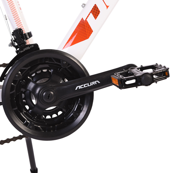 Износостойкие покрышки с глубоким протектором делают сцепление с дорожным покрытием надежным. Диаметр колес равен 26". Быстрое и безопасное торможение достигается за счет механической дисковой системы. Конфигурацией предусмотрены двойной обод, сиденье спортивного типа и подножка.