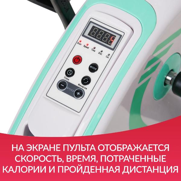 Компактная модель обладает следующими параметрами: вес — 4,5 кг габариты — 39х36х50 см. Устойчивость обеспечивают резиновые упоры. Размер одной педали составляет 9,2х2,9 см. На корпусе расположен цифровой дисплей с кнопками управления. Также доступно удаленное управление с пульта (в комплекте). На экране отображаются время тренировки, скорость, потраченные калории и пройденная дистанция.