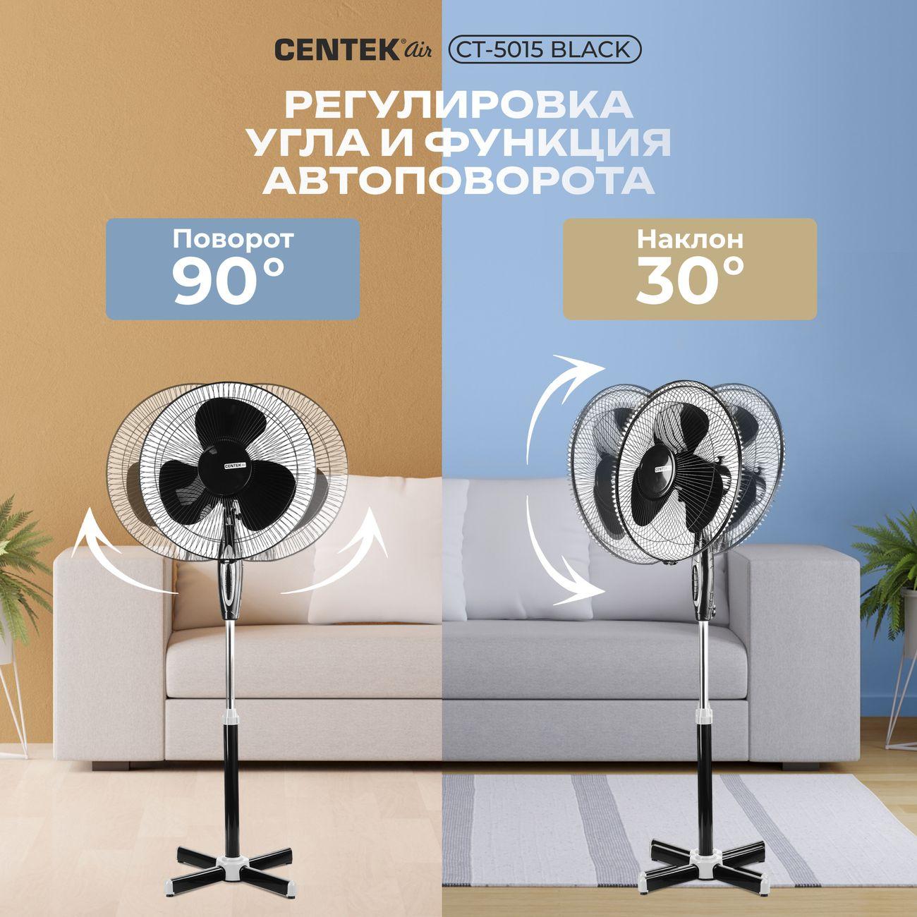 Centek CT-5015 — это стильный напольный вентилятор. Крестовина обеспечивает его устойчивость и предотвращает опрокидывание. Три больших лопасти (диаметр — 43 см) вращаются в трех скоростях. Менять настройки можно с помощью встроенной панели. Все показания отображаются на встроенном LED-дисплее.