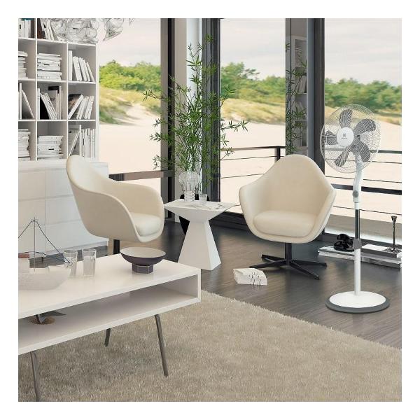 Сверху размещена решетка, защищающая от попадания внутрь посторонних предметов и мусора. Предельная потребляемая мощность — 50 Вт, уровень шума — 33 дБ. Для соединения с электрической розеткой используется кабель длиной 1,5 м. Материал изготовления корпуса — пластик. Цвет — белый. Габариты — 135х43х43 см. Диаметр винта — 40 см, обода — 43 см. Вес — 4,3 кг.