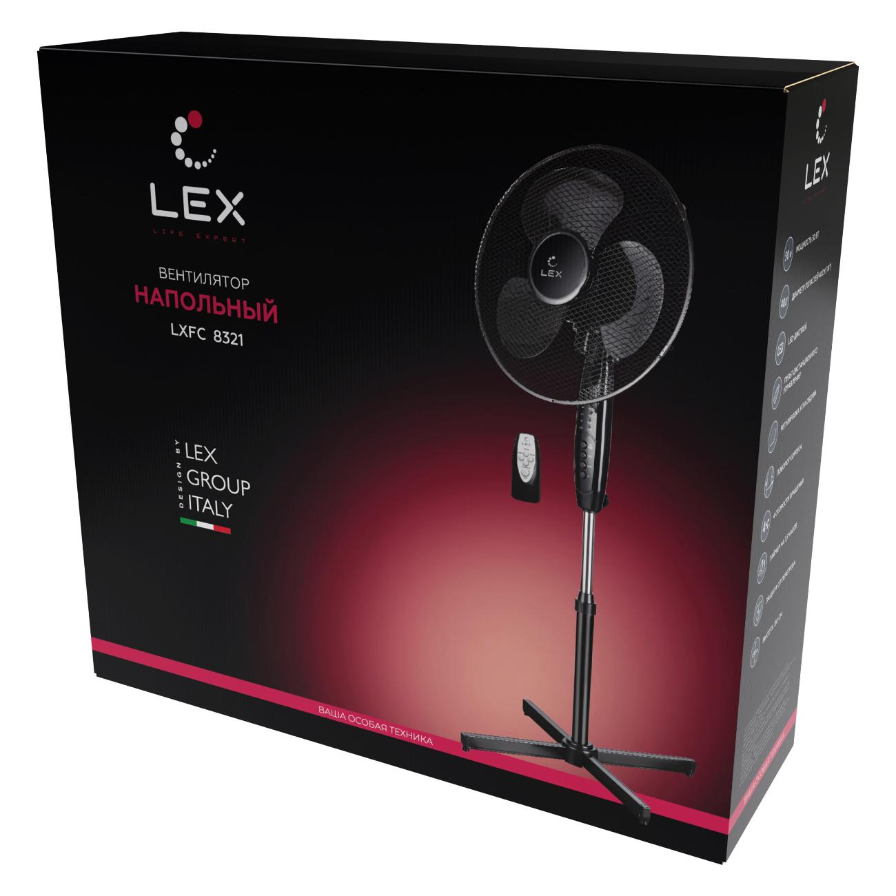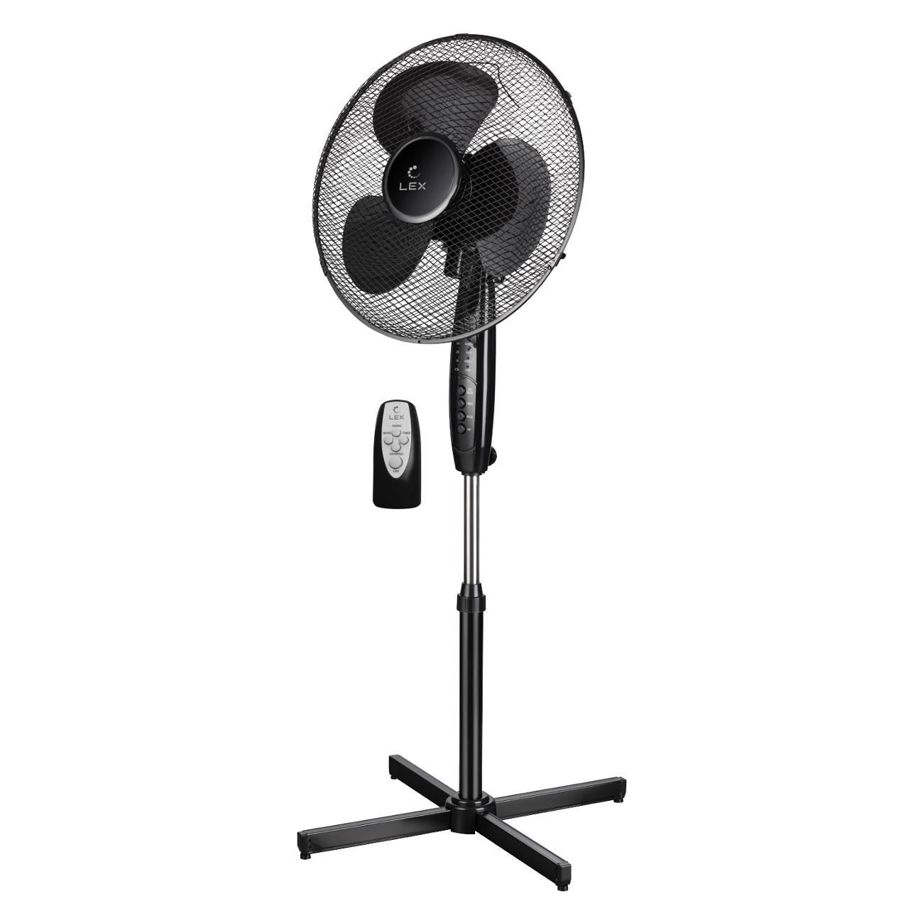 Напольный вентилятор Lex LXFC 8321, черный работает в трех скоростях и создает поток воздуха интенсивностью до 2500 куб. м/ч. Управлять прибором можно с панели на корпусе или с дистанционного пульта, который входит в комплект. Есть таймер с автоматическим отключением, он устанавливается от 0,5 до 7,5 часов.