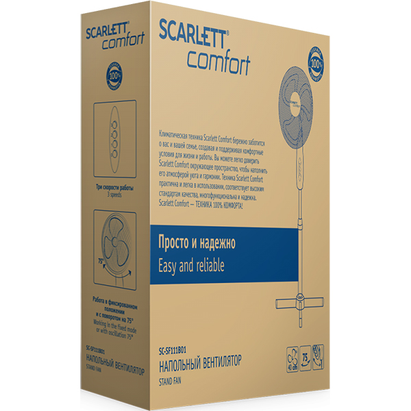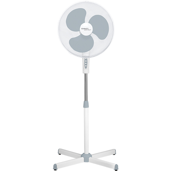 Напольный вентилятор Scarlett SC-SF111B01 оснащен электронной системой управления, позволяющей выбрать один из трех скоростных режимов. Уровень шума не превышает 52 дБ. Производительность достигает 2500 м³/ч. Можно регулировать высоту, угол и наклон вращения, чтобы направить воздушный поток в нужную сторону.