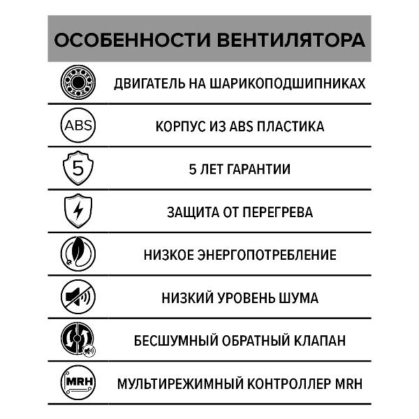 Вытяжной вентилятор DiCiTi Breeze 5C MRH отличается тонкой лицевой панелью, поэтому модель будет хорошо смотреться на стене. Двигатель находится на шарикоподшипниках. От перегревания устройство защищает предохранитель.