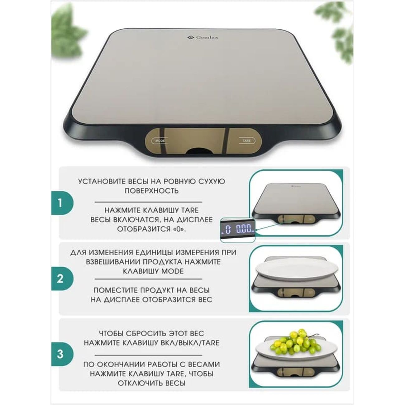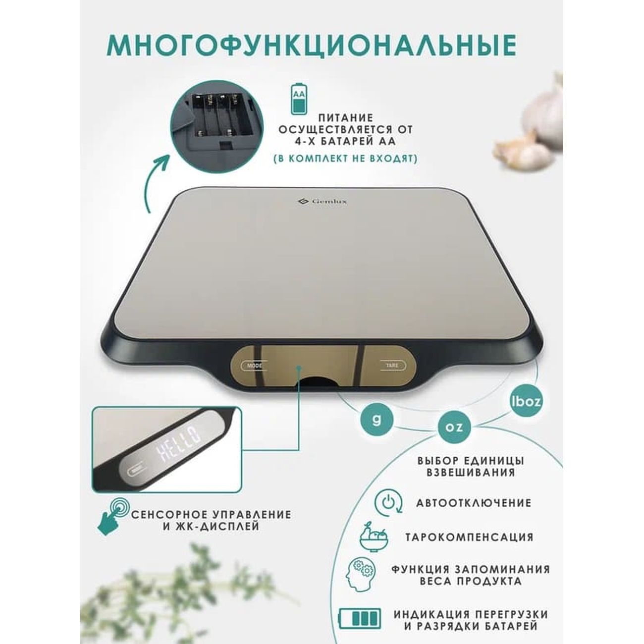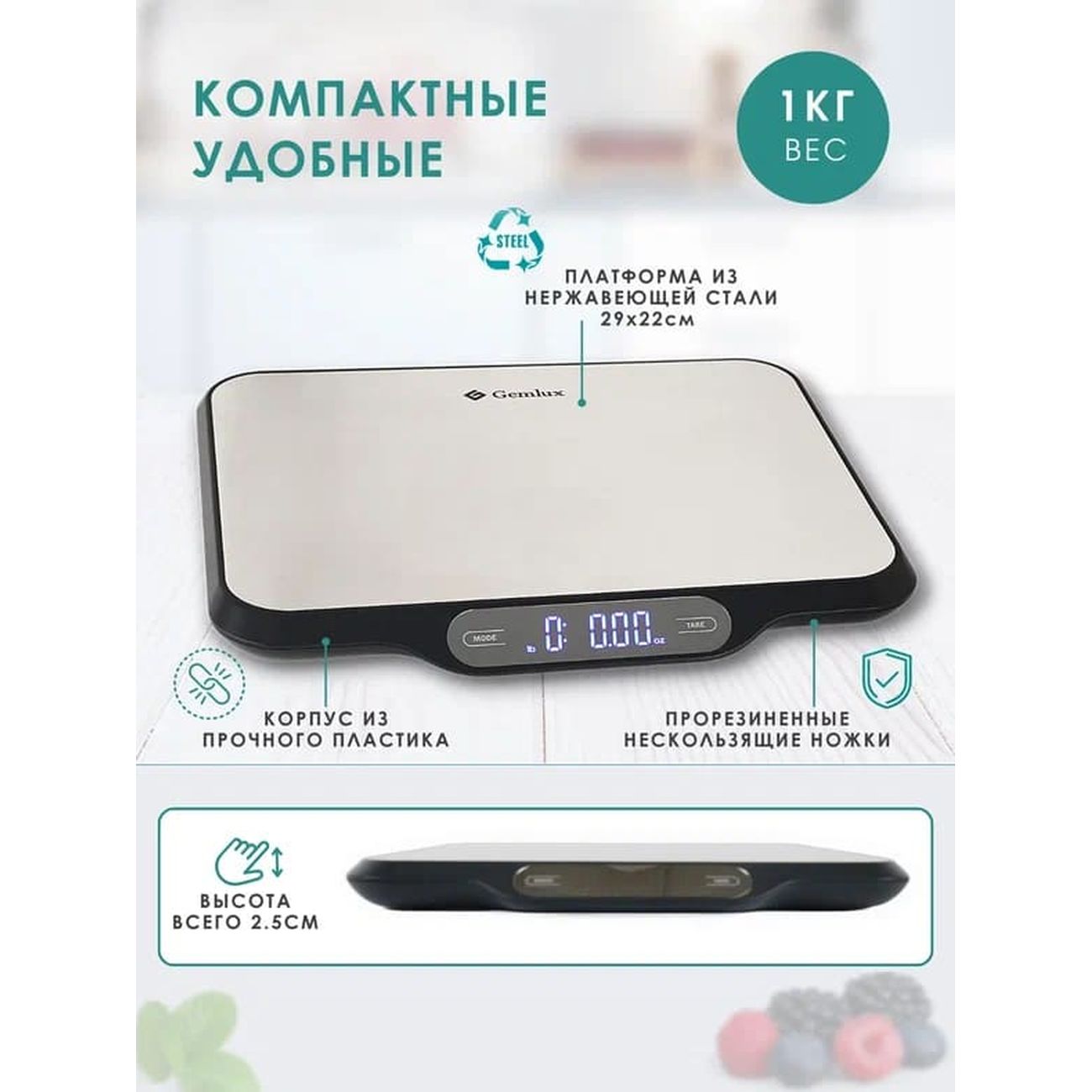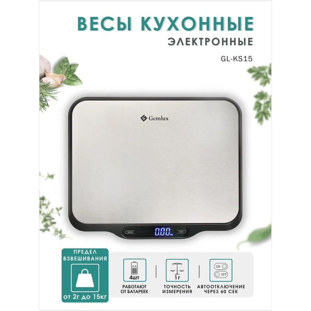 Gemlux GL-KS15 — электронные весы с сенсорным управлением и платформой из нержавеющей стали. Для вывода результатов используется встроенный жидкокристаллический дисплей. Есть режим сброса тары, индикация перегрузки и разрядки батареек. Питается модель от четырех батареек типа АА. Максимальный взвешиваемый вес — 15 кг с точностью до 1 г. Весы могут измерять в граммах, миллилитрах, унциях и фунтах.