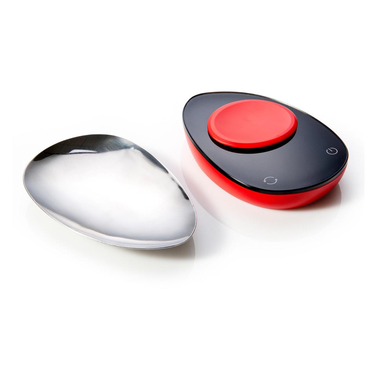 Дисплей показывает вес, сообщает о перегрузке или разряде батареи. Питание осуществляется от двух батареек формата ААА (в комплекте). Корпус и чаша выполнены из пластика, прорезиненные ножки обеспечивают устойчивость прибора на поверхности. Вес устройства — 123 г.