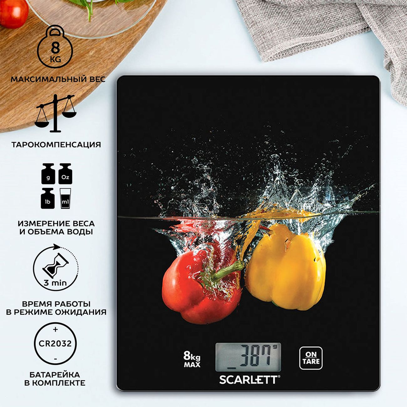 Включаются и отключаются весы автоматически. Для работы требуется батарейка типа CR2032, она уже входит в комплект поставки. Платформа выполнена из прочного закалённого стекла и украшена ярким рисунком, благодаря которому эта модель станет заметной деталью кухонного интерьера.
