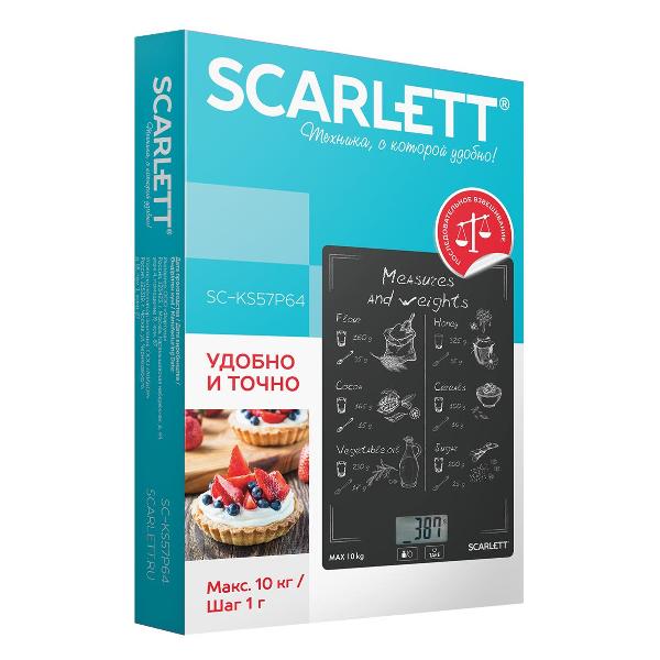 Кухонные весы Scarlett SC-KS57P64 — электронное устройство черного цвета, рассчитанное на нагрузку до 10 кг. Предусмотрена функция сброса (обнуления) веса. Возможно измерение объема продукта. Погрешность минимальная — 1 г. Доступна функция тарокомпенсации.