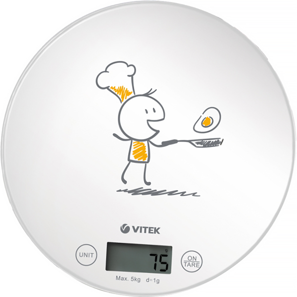 Кухонные весы Vitek VT-8018 украшены изображением веселого поваренка. Модель работает от одной батарейки CR 2032 (входит в комплект). Весы электронные, рассчитаны на максимум 10 кг. Цена деления составляет 1 г. Есть опция сброса веса тары и функция последовательного взвешивания, перевод граммов в унции. Управление весами сенсорное, есть цифровой дисплей, индикаторы перегрузки и разрядки батареи. Устройство выключается автоматически. Платформа весов сделана из стекла. Снизу находятся прорезиненные нескользящие ножки.