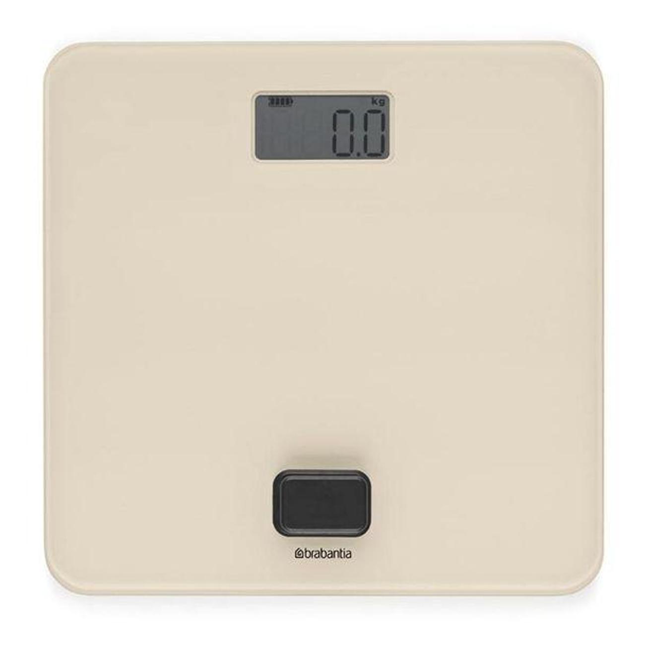Напольные весы Brabantia 223525 бежевого цвета функционируют без использования батареек. Питание запускается нажатием на кнопку, встроенную в лицевую часть прибора. Модель электронного типа оснащена сенсорным модулем и ЖК-дисплеем с подсветкой, на котором отображаются измерения в пределах 180 кг. Устройство отключается автоматически спустя 1 минуту.