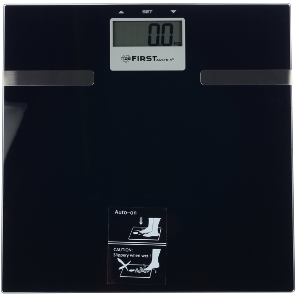 Напольные весы First 8006-3-BA выполнены из ударопрочного пластика и закаленного стекла и рассчитаны на нагрузку до 150 кг с точностью до 100 г. Эта модель оснащена сенсорной панелью управления, измеряет количество жира, воды, мышц и костной ткани в теле. В памяти устройства можно сохранять данные на 12 человек.