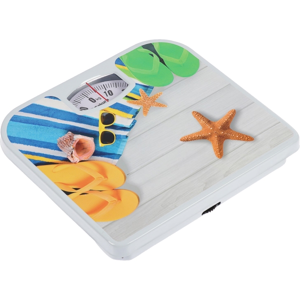 Механические напольные весы Sakura SA-5000-2 выполнены в корпусе из металла и пластика, на который нанесен рисунок «Отпуск». Модель может измерять вес до 130 кг — для отображения используется поворотная платформа со стрелкой и ценой деления 1 кг. Для правильной работы весов температура в помещении должна быть в рамках от 5°С до 40°С.