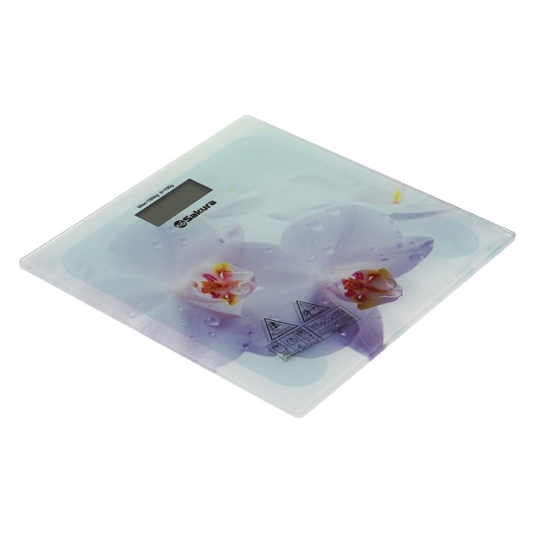 Электронные напольные весы Sakura SA-5065WF с дисплеем размером 72х28 мм выполнены в корпусе из закаленного стекла толщиной 6 мм с рисунком «Белые орхидеи». Модель позволяет измерять вес до 180 кг с погрешностью 100 г. Весы включаются от прикосновения (когда пользователь встает на них) и оснащены системой автоматического отключения. Модель снабжена индикатором перегрузки и разряда — весы получают питание от батарейки CR2032, которая есть в комплекте поставки.